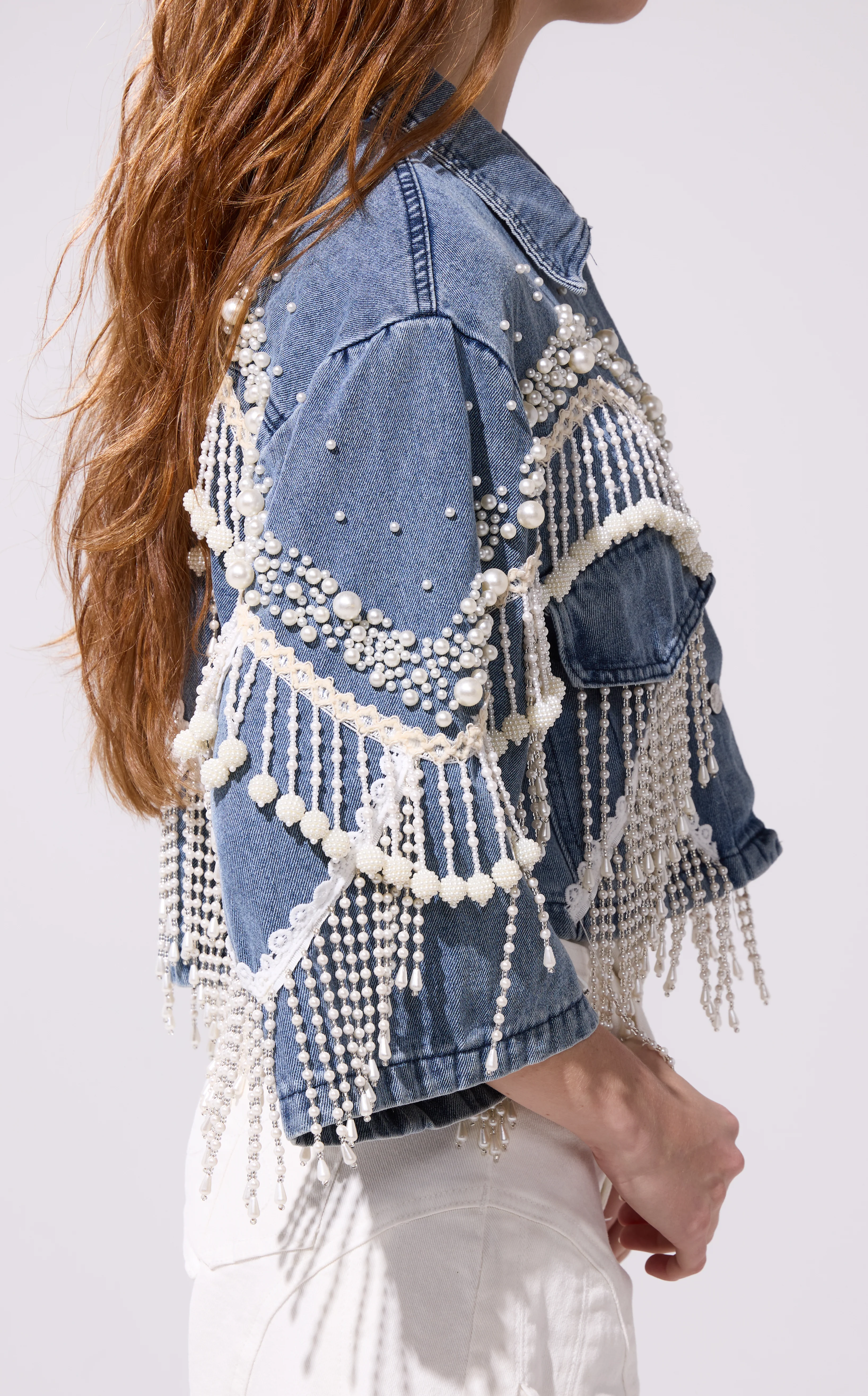 Denim jacket completely decked out in pearls—bold, fashion-forward, and instantly elevates any outfit with effortless cool.