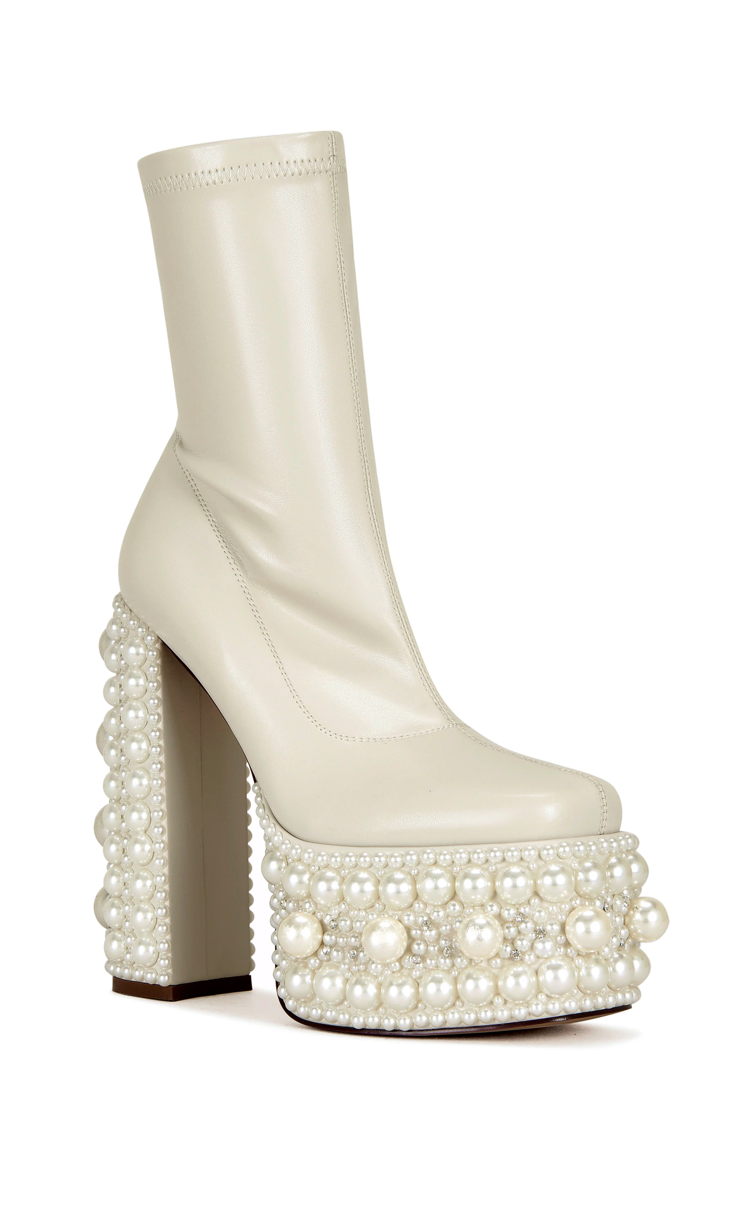 Make an entrance in this cream platform bootie, fully embellished with pearls along the sole and heel—equal parts glam and unexpected.