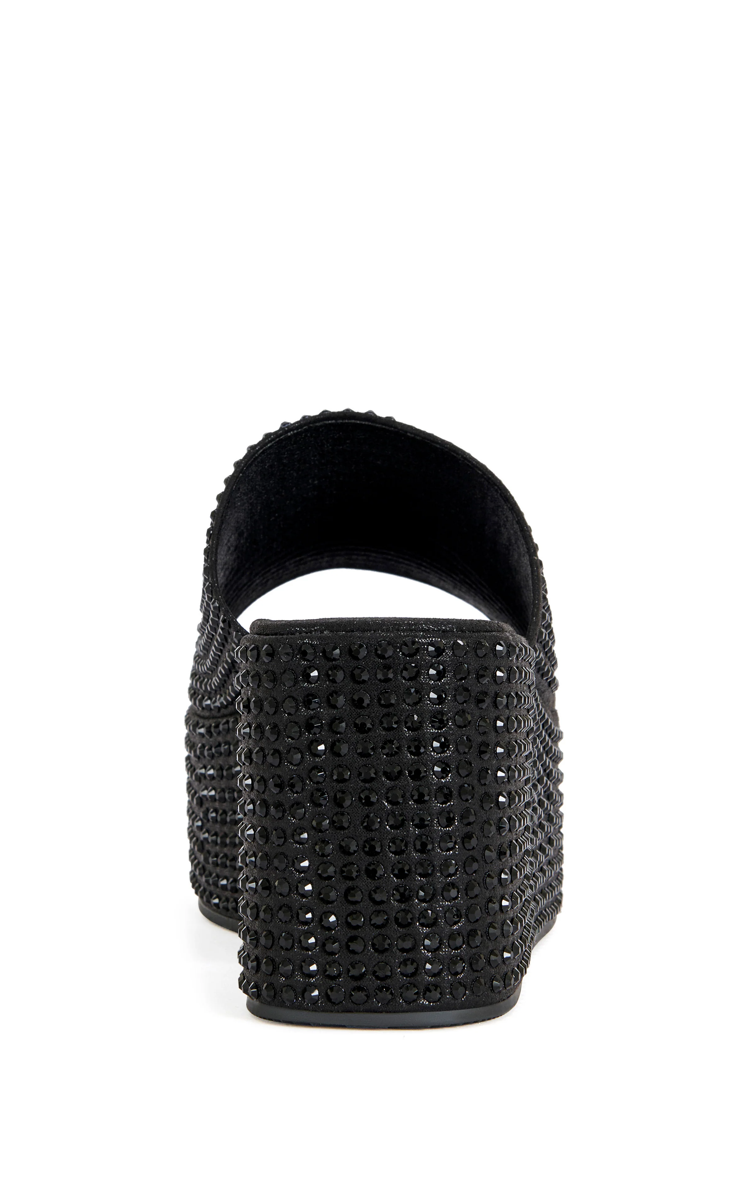 Black platform slip-on sandal fully covered in rhinestones—sparkly, bold, and built to make an entrance.