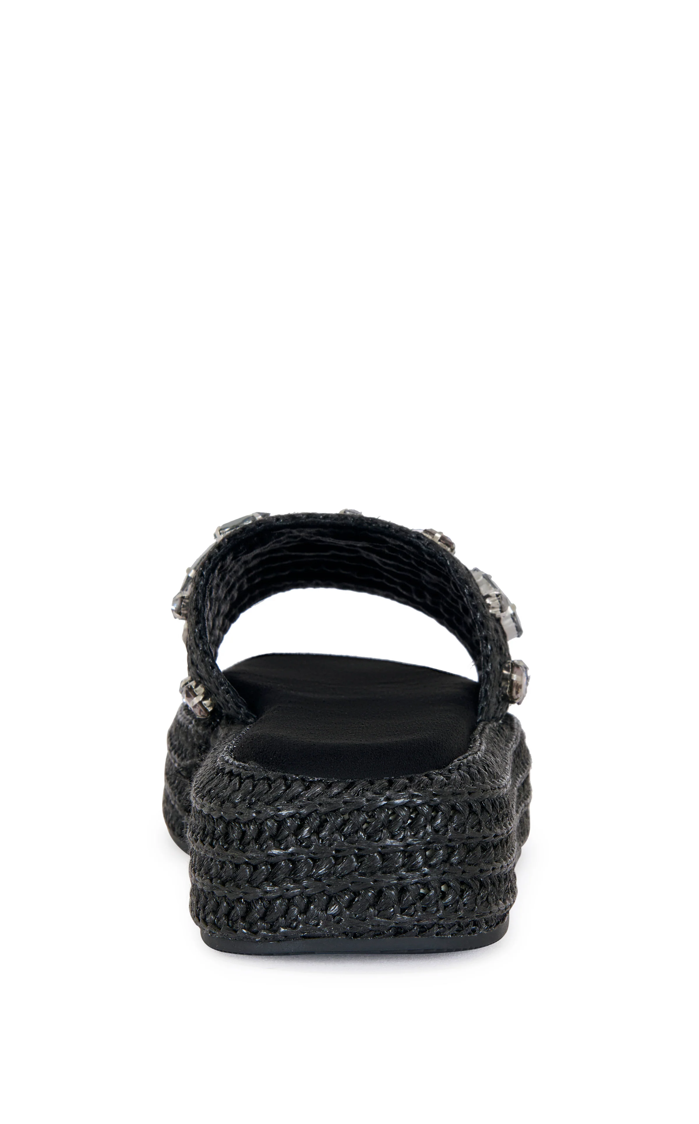 The chunky rhinestone embellishments on the foot strap add a touch of glamour to an otherwise effortless raffia slide, making these sandals perfect for any occasion. Go crazy.Â