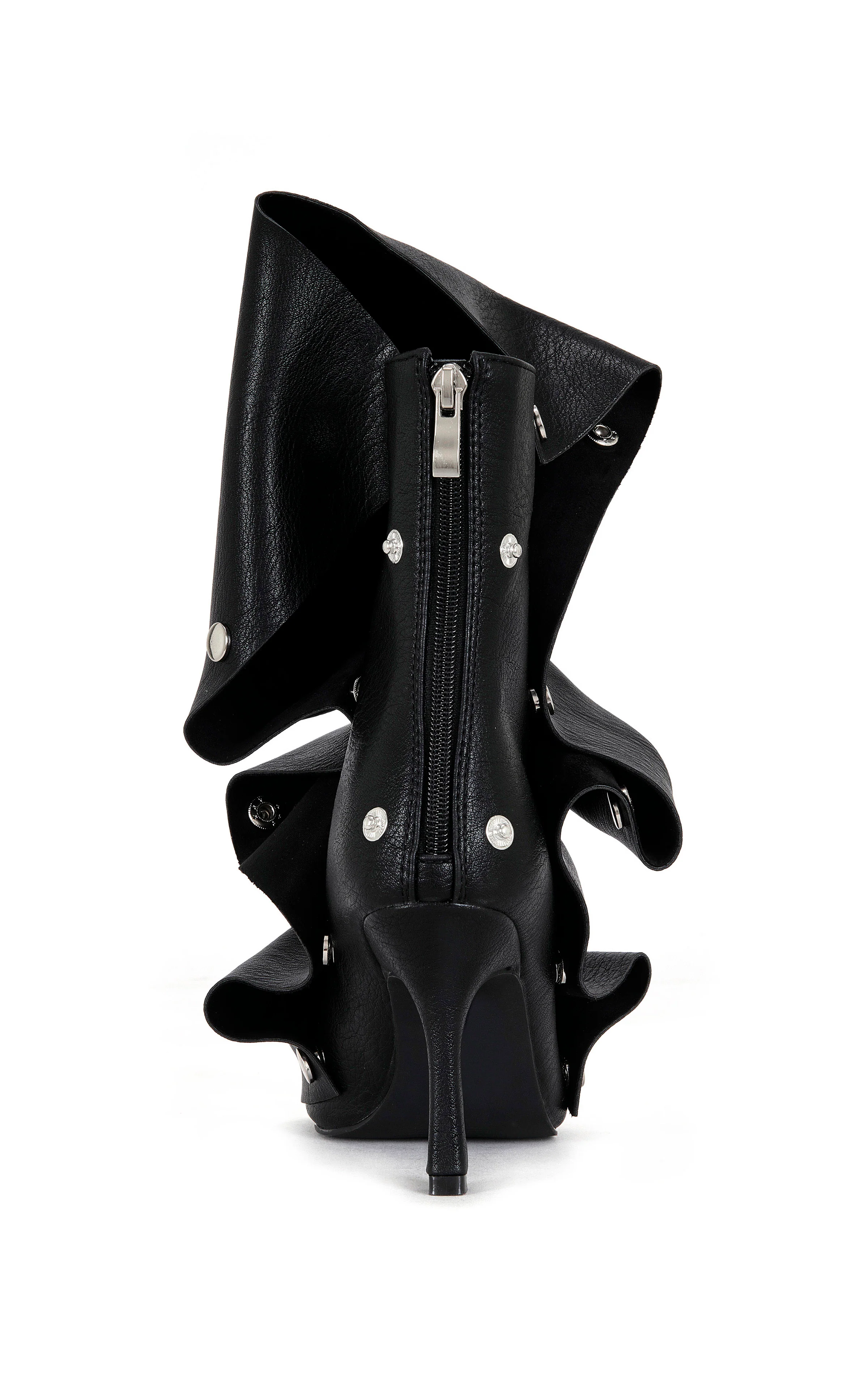 Unleash your inner popstar with these striking booties. Crafted from premium faux leather, their slouch overlay and functional snaps create an edgy-glam look that sets you apart. The peep-toe design adds a touch of allure, so go and turn those heads.