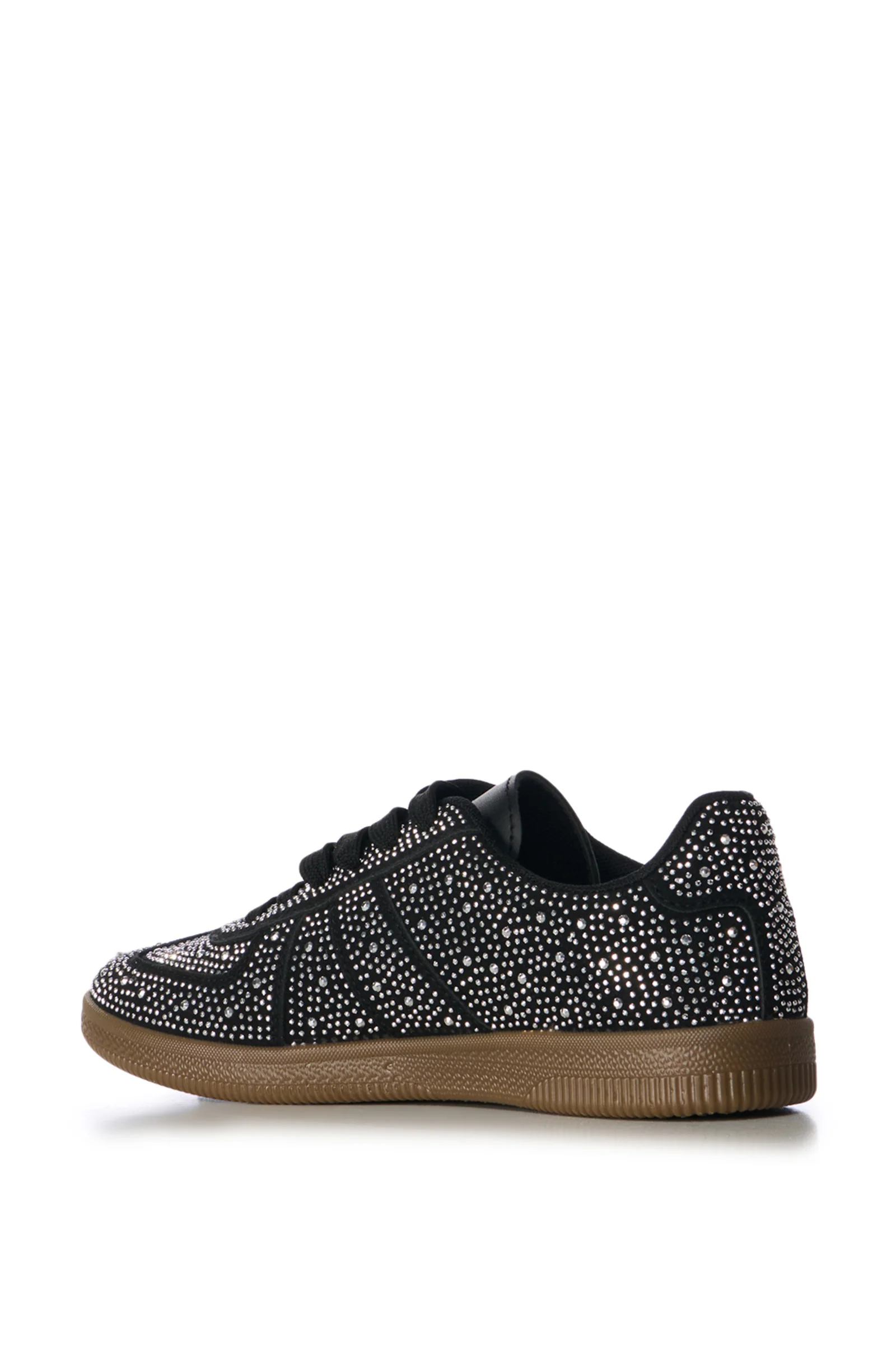 These black low top sneakers are designed for both style and comfort. Featuring a subtle silver crystal embellishment all over the upper and a lace up design, these sneakers are perfect for any occasion.Â