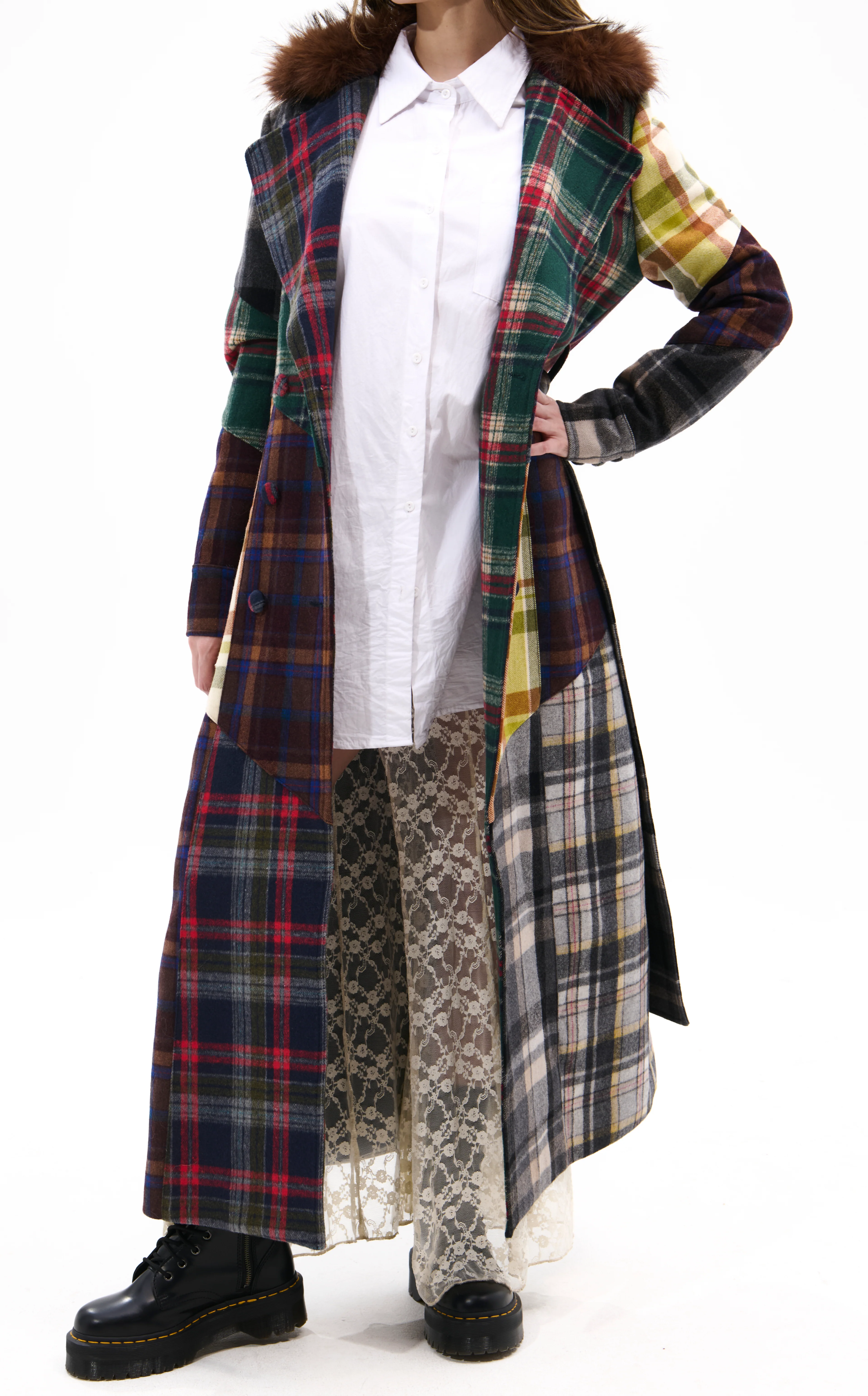 Plaid trench coat, a timeless layering piece that blends classic pattern with modern tailoring for polished street style, plus a faur fur trim and belt for added drama.