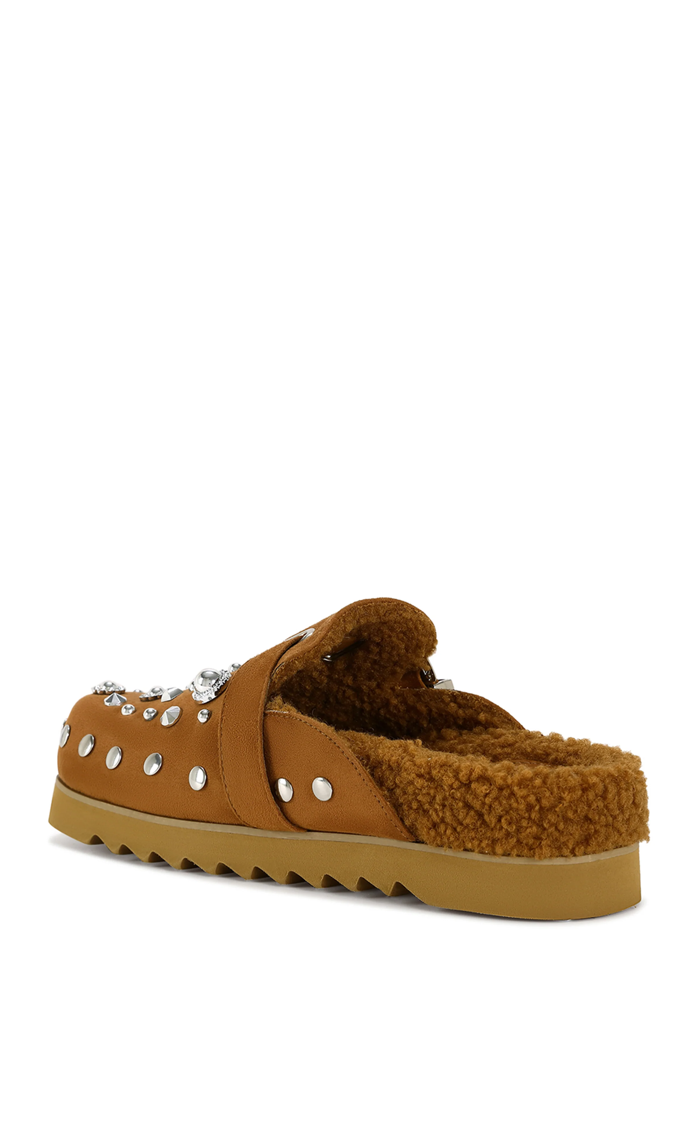 Experience the perfect blend of comfort and style with the CHATTER mule. Slip into these brown faux leather mules and stay cozy with the faux fur inner lining. The western inspired silver stud embellishments add a touch of edginess, while the ridged black sole provides traction and durability.