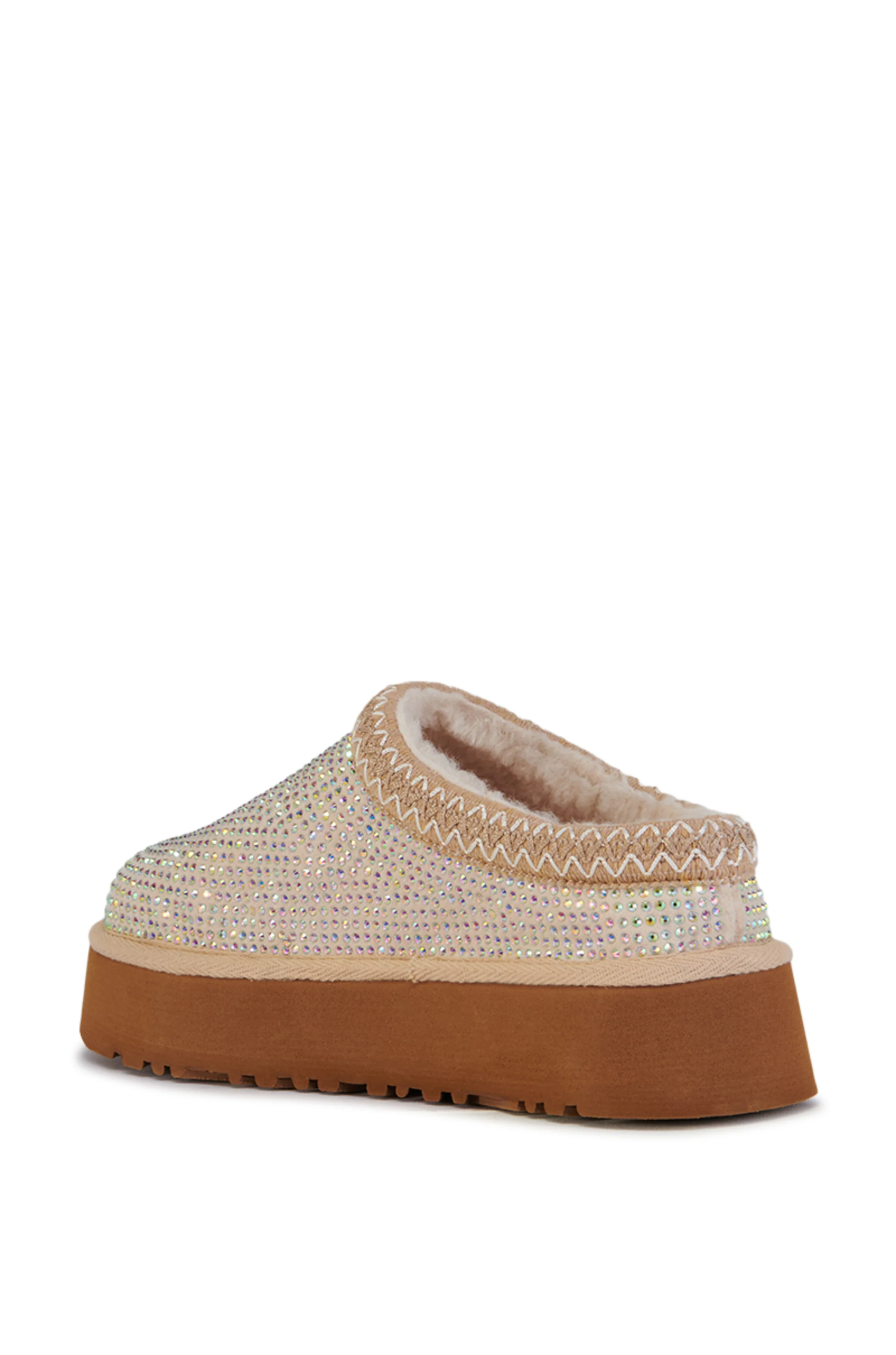 Indulge in cozy comfort with our DAVIAT slipper. This white slip on platform slipper features crystal rhinestone embellishments all over the upper and delicate stitching around the opening of the shoe. Finished off with a beige platform sole. Style these for an extra touch of glam to a laid-back look.Â