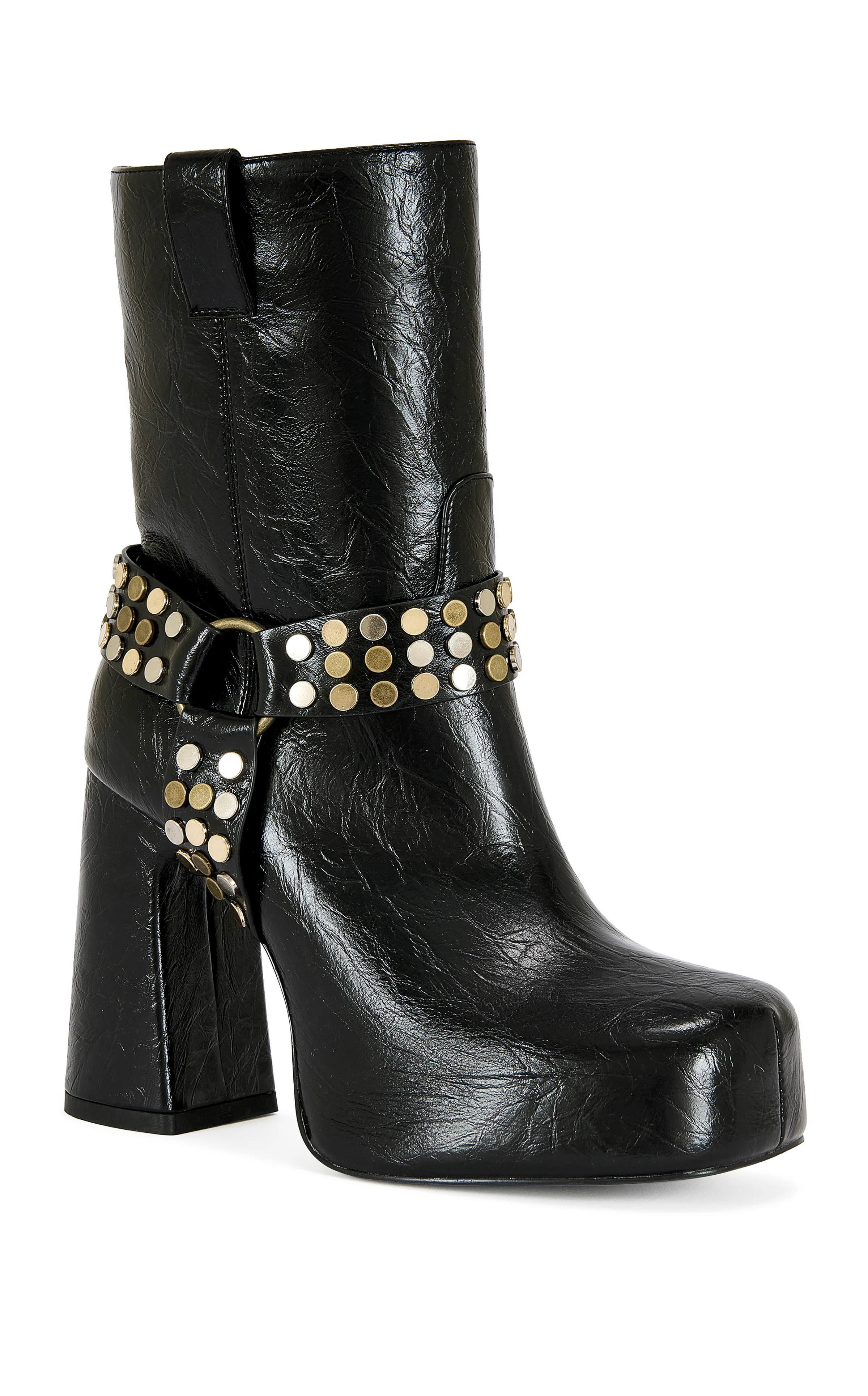 Platform bootie with a chunky block heel and bold embellished moto details — the perfect mix of edgy attitude and high-fashion polish.