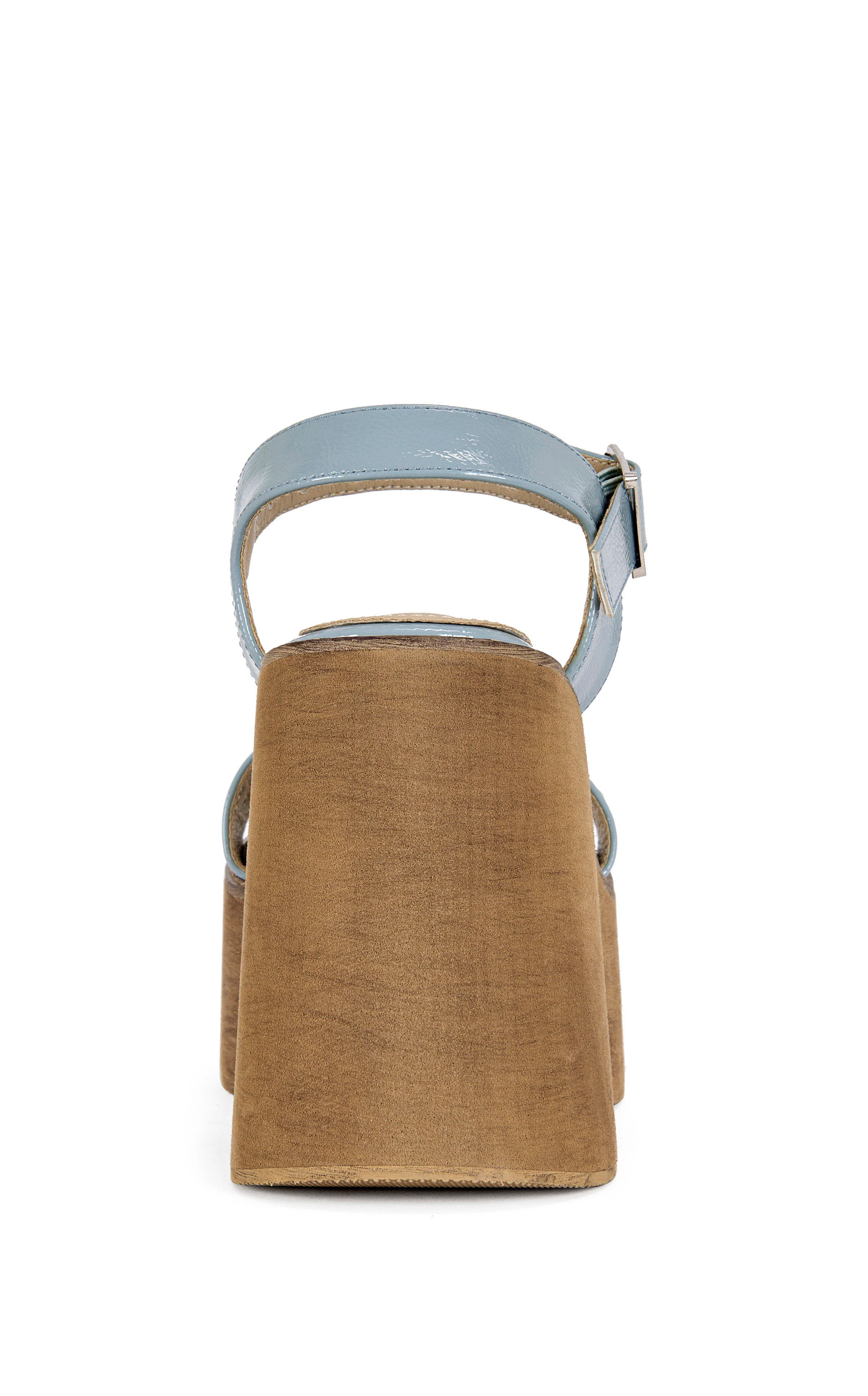 Wood platform sandal with a soft baby blue faux leather upper and clean gold flat studs—fresh, playful, and effortlessly elevated.