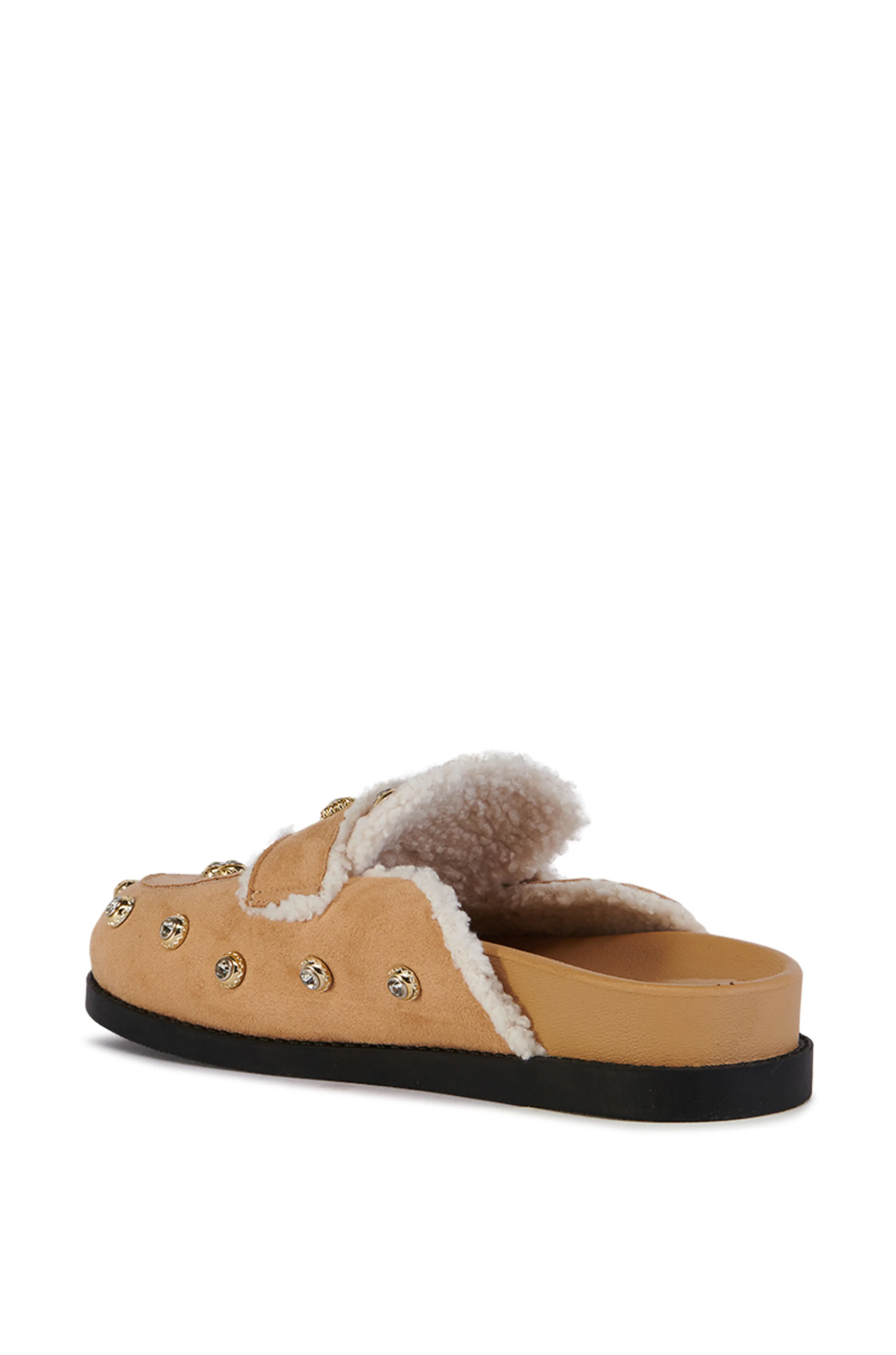 Introducing our ESTELLER slipper, a chic slip-on shoe with a cozy faux sherpa lining. This beige mule features a rounded toe, black base sole, and circular stud embellishments all over the faux suede upper. Style these with a laid-back outfit to complete the look.