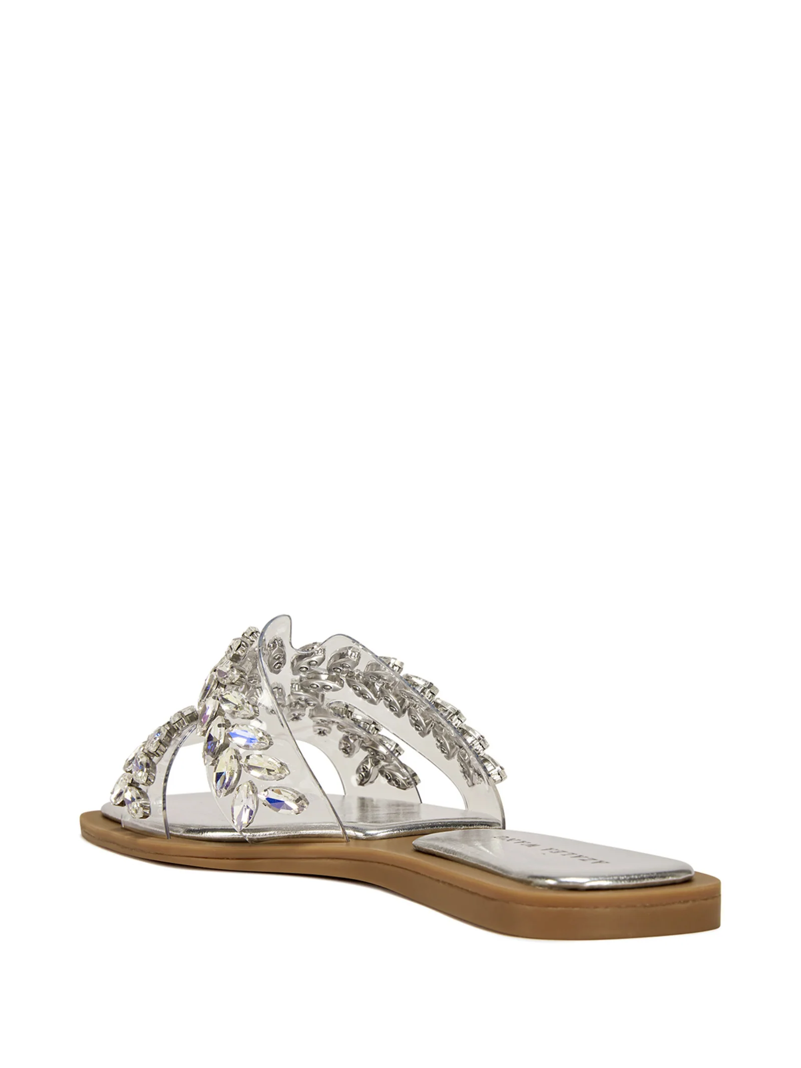 Designed for statement-making style, the FALKEN-SILVER FLAT SANDAL adds a touch of glamour to any outfit. With a PVC strap adorned with sparkling crystal rhinestones, this sandal is both chic and stylish.