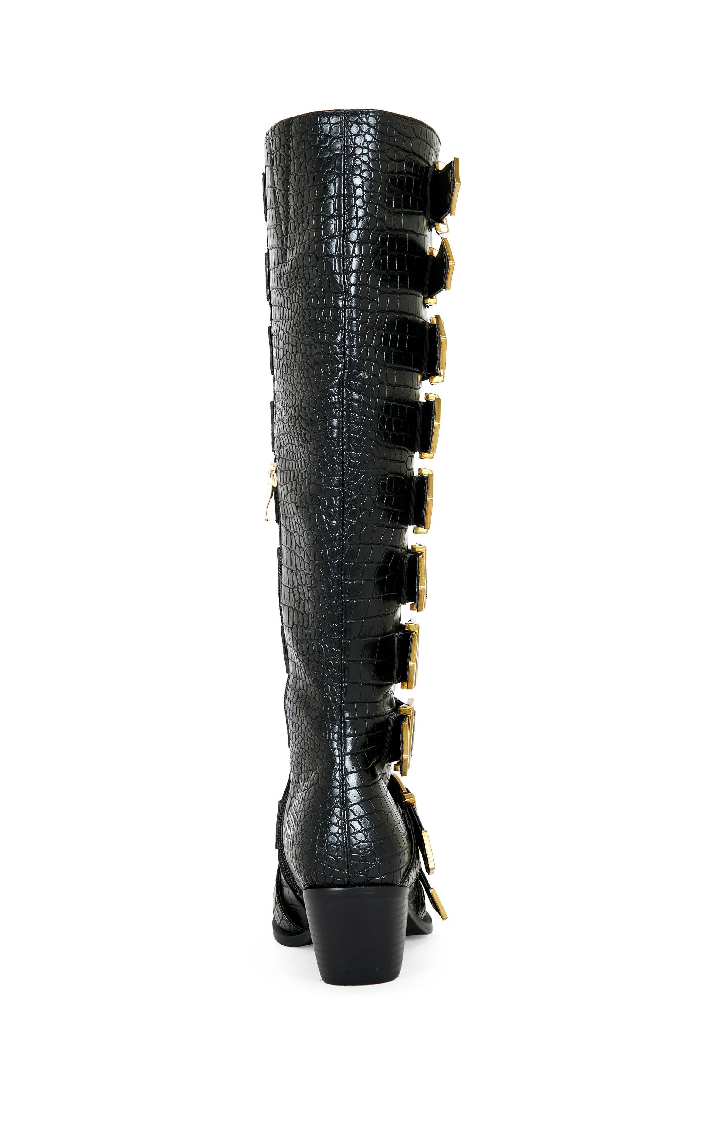 Faux black croc western-inspired boot with a sharp point toe, bold block heel, and gold buckle detailing lined up the shaft for a striking statement look.