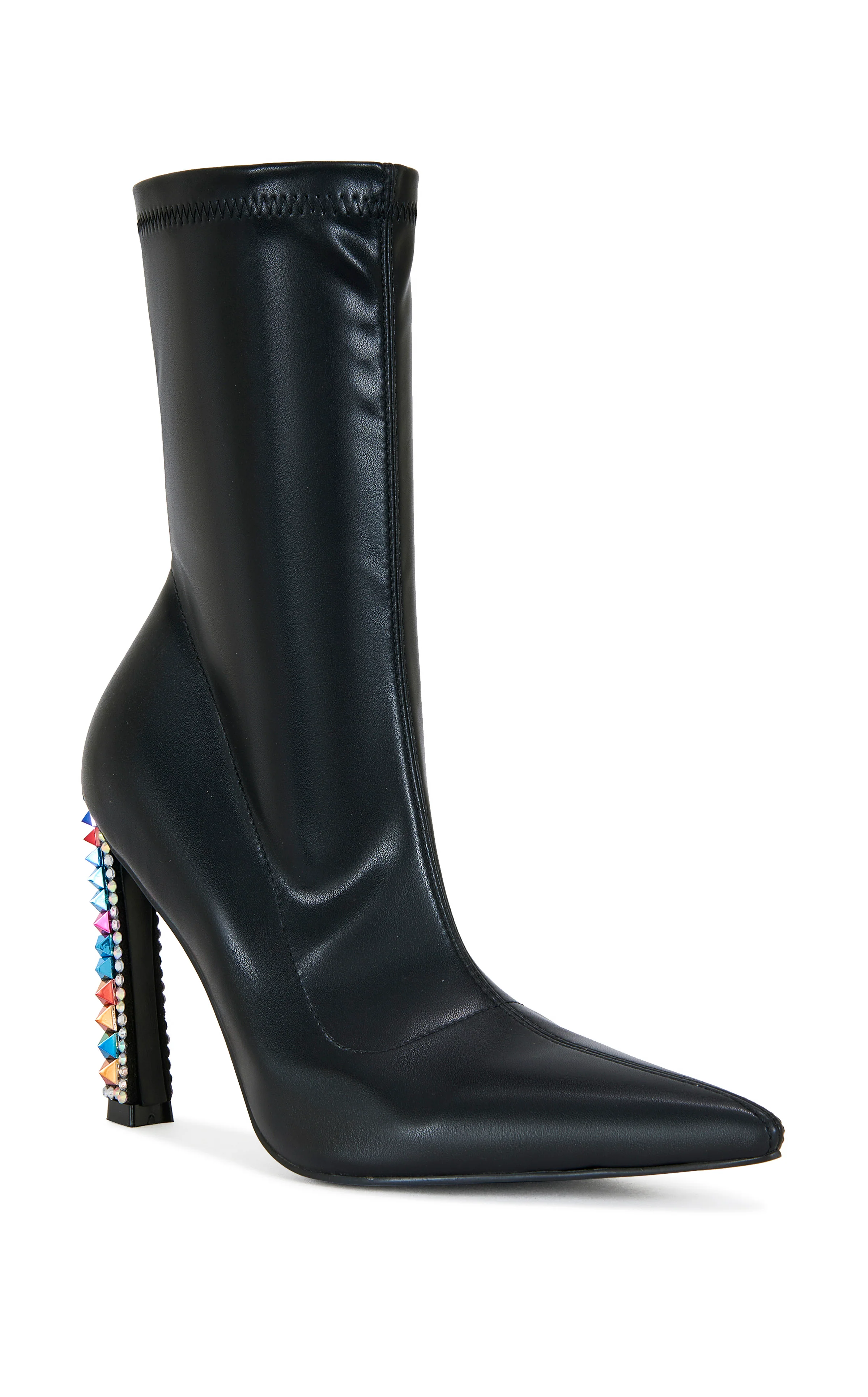 Black stretch ankle bootie with a sleek point toe and a multicolored bedazzled angled block heel, the perfect party-ready shoe for New Year’s Eve and beyond.