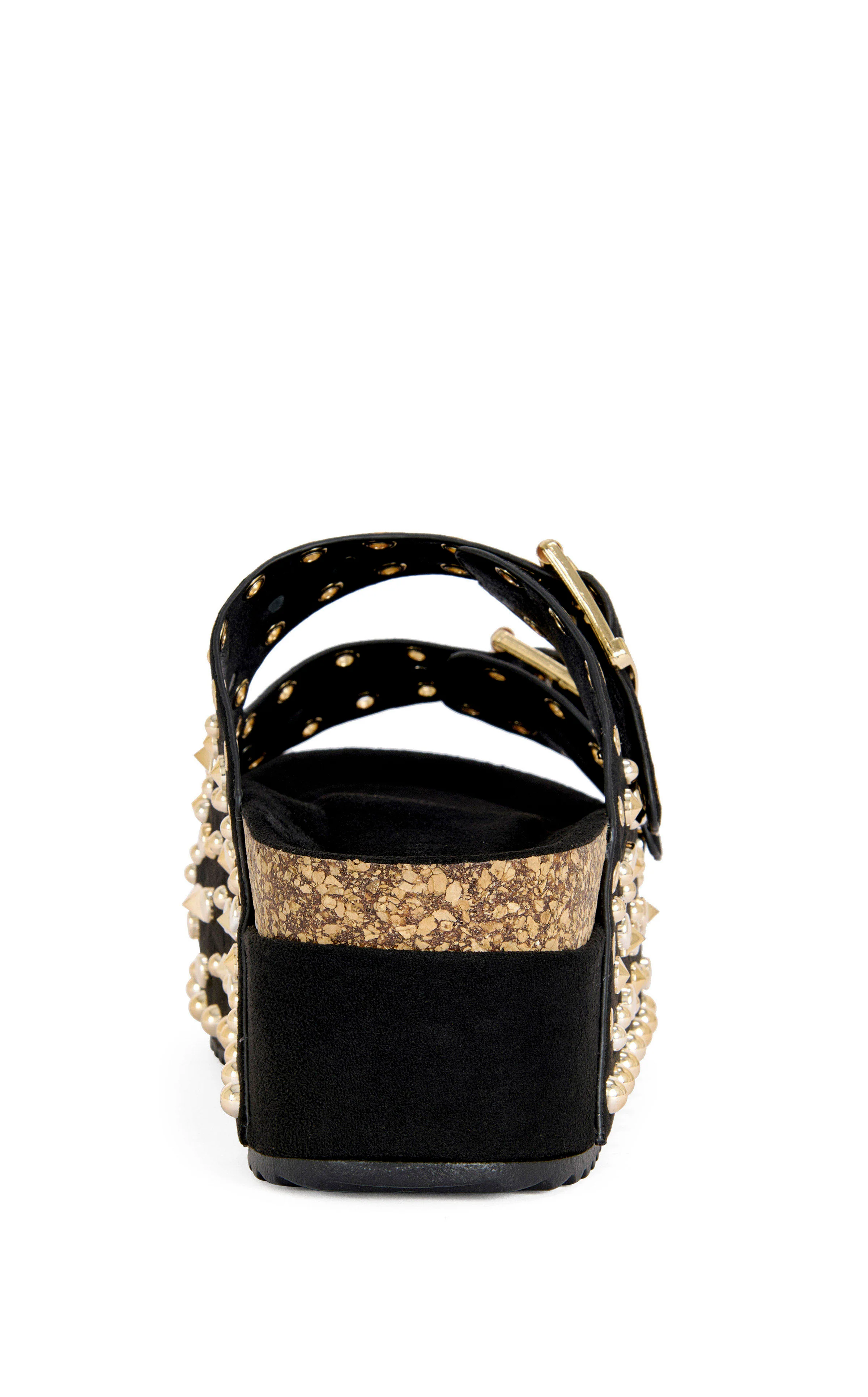 Faux suede flatform slip-ons fully covered in embellishments—bold, elevated, and effortlessly statement-making.