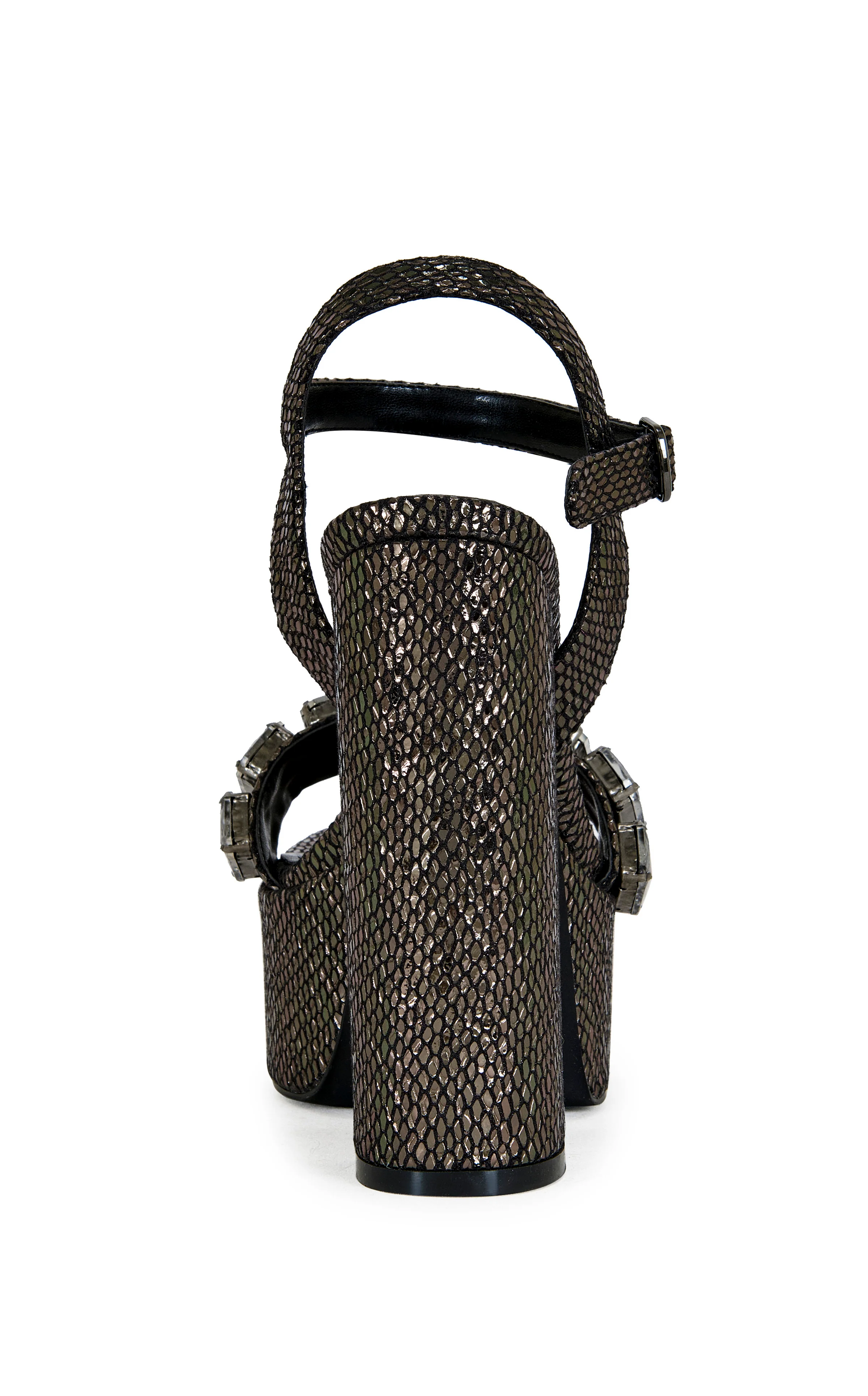 Platform metallic snakeskin sandal with oversized gunmetal rhinestones lining the strap, a bold and edgy statement heel for nights that shine.