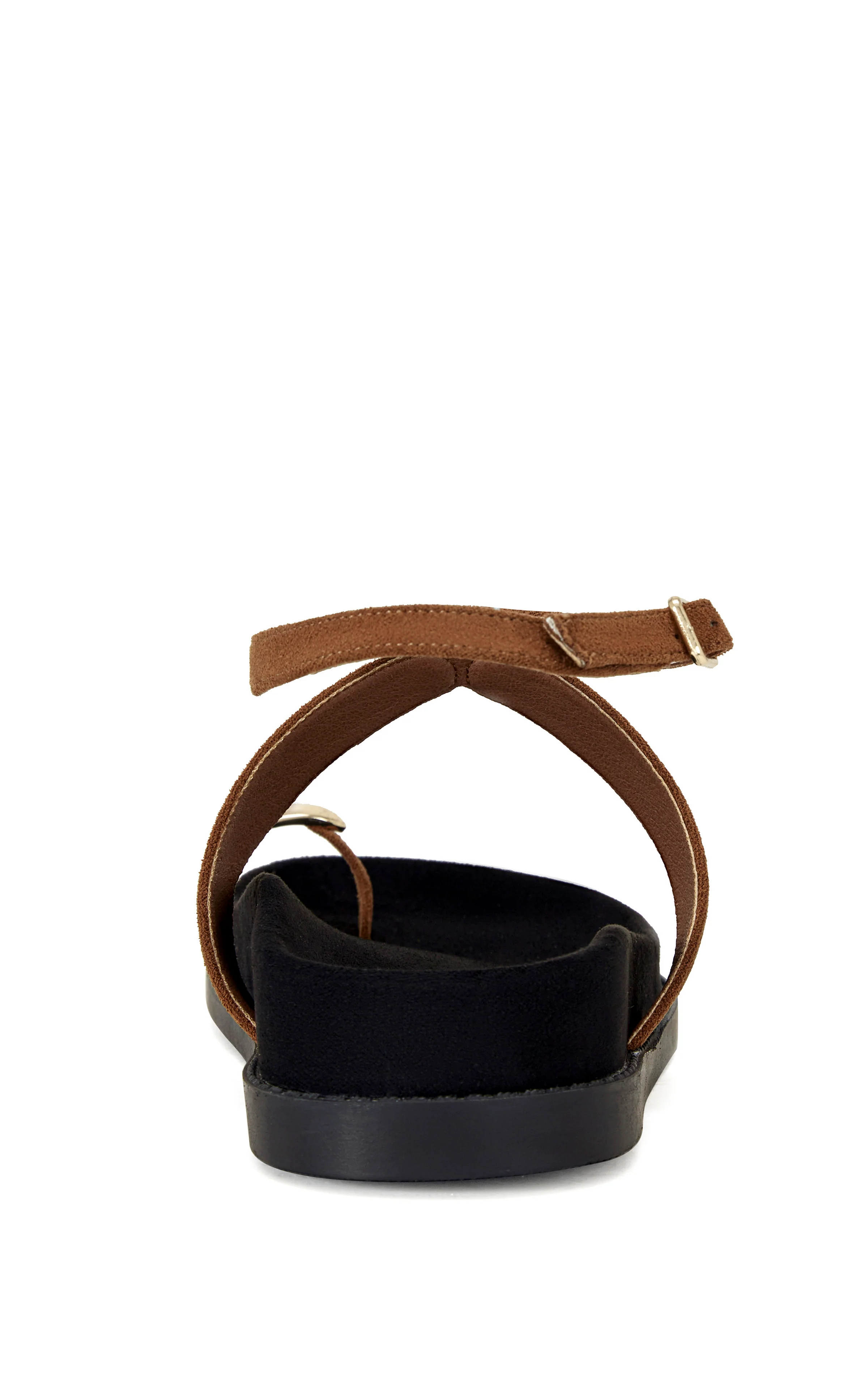 Our KANI sandal is a must-have for the Summer season. The black open toe design is accented with a soft brown faux suede toe and ankle strap. The fashion forward toe strap features a gold hardware accent for a glamorous finishing touch to the silhouette.