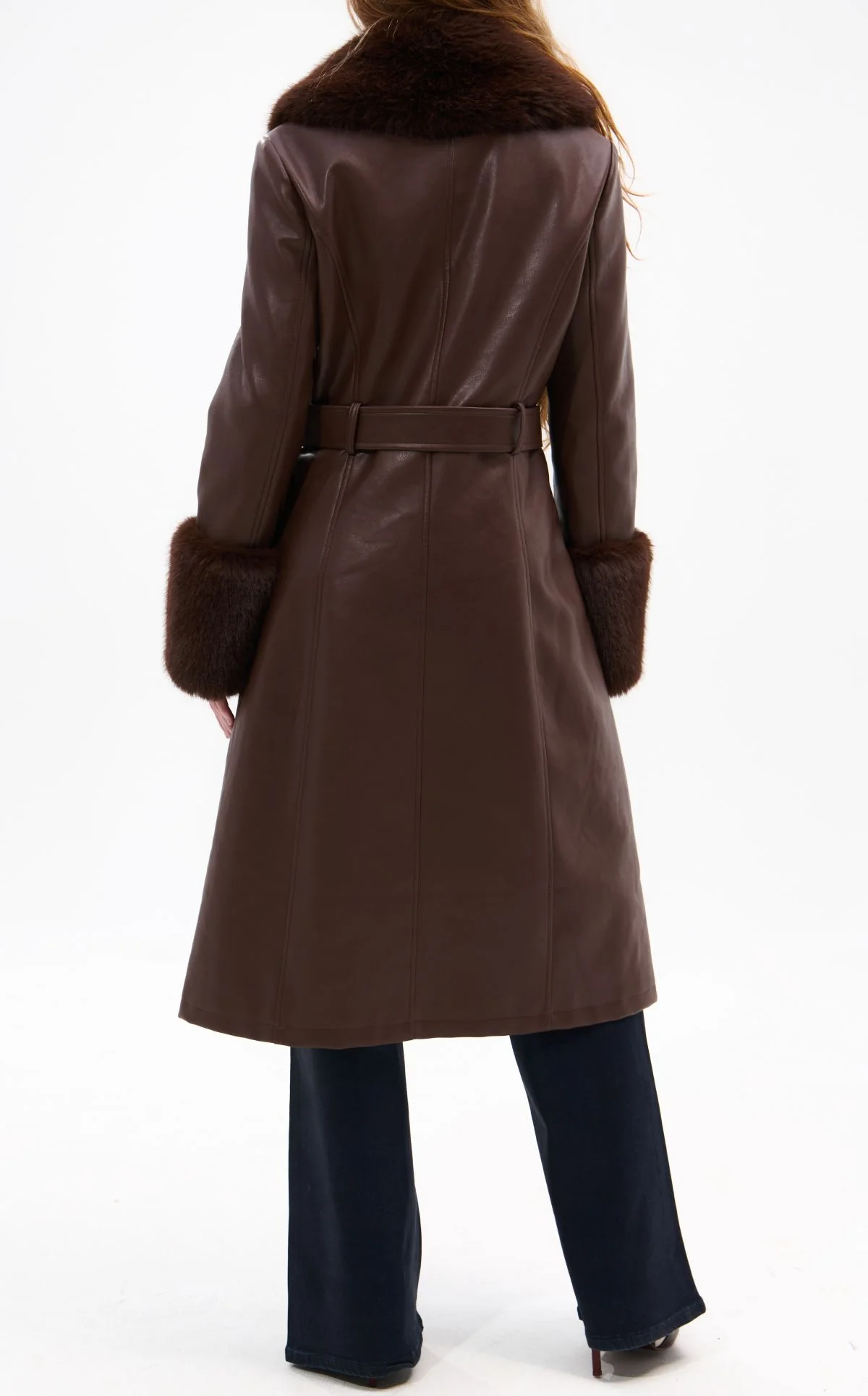 This Penny Lane-inspired trench features chocolate brown faux leather, tonal brown faux fur trim, and a removable belt—equal parts cozy and iconic.