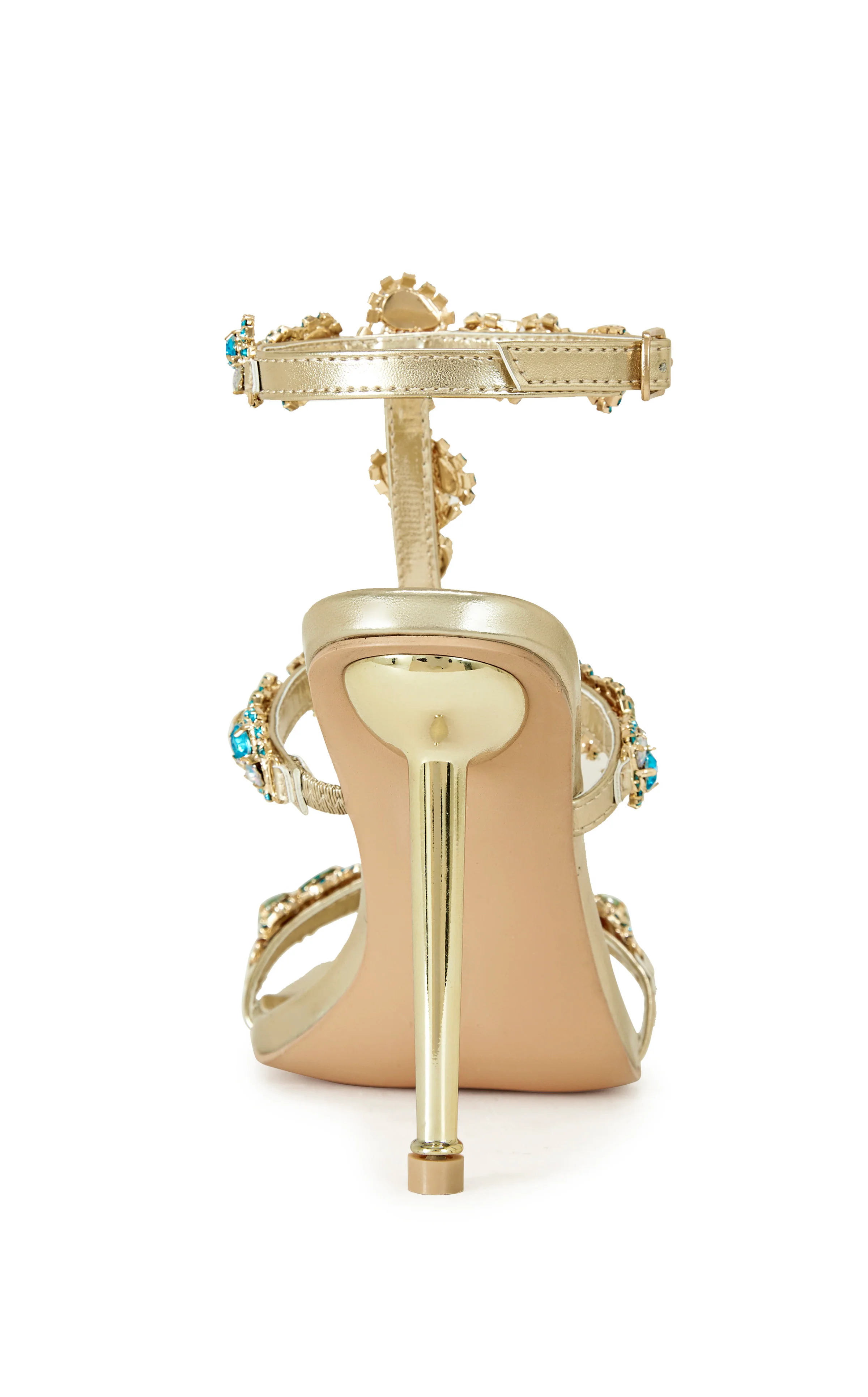 Add the finishing touch to your lux looks with the KHAI heel. Made with gold faux leather and adorned with colorful rhinestone embellishments, these strappy stilettos add a touch of glamour to any outfit. The adjustable ankle strap provides an extra secure fit. Perfect for special occasions or a night out.