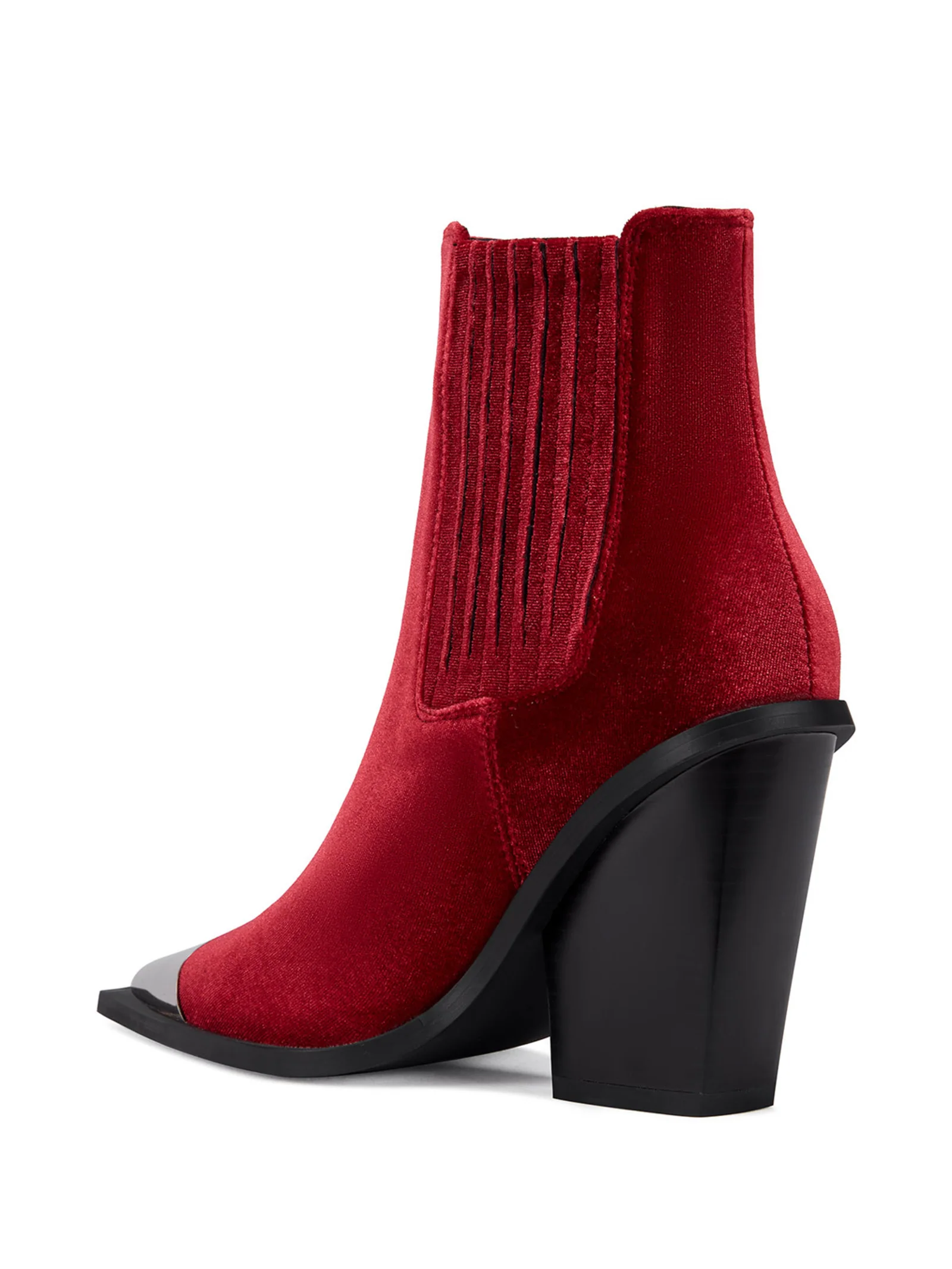 Elevate your style with our Lachlan Velvet Bootie. Crafted with deep red velvet, this western bootie features a black block heel and silver hardware toe for a touch of elegance. Perfect for any occasion, these booties are sure to add a pop of color to any look
