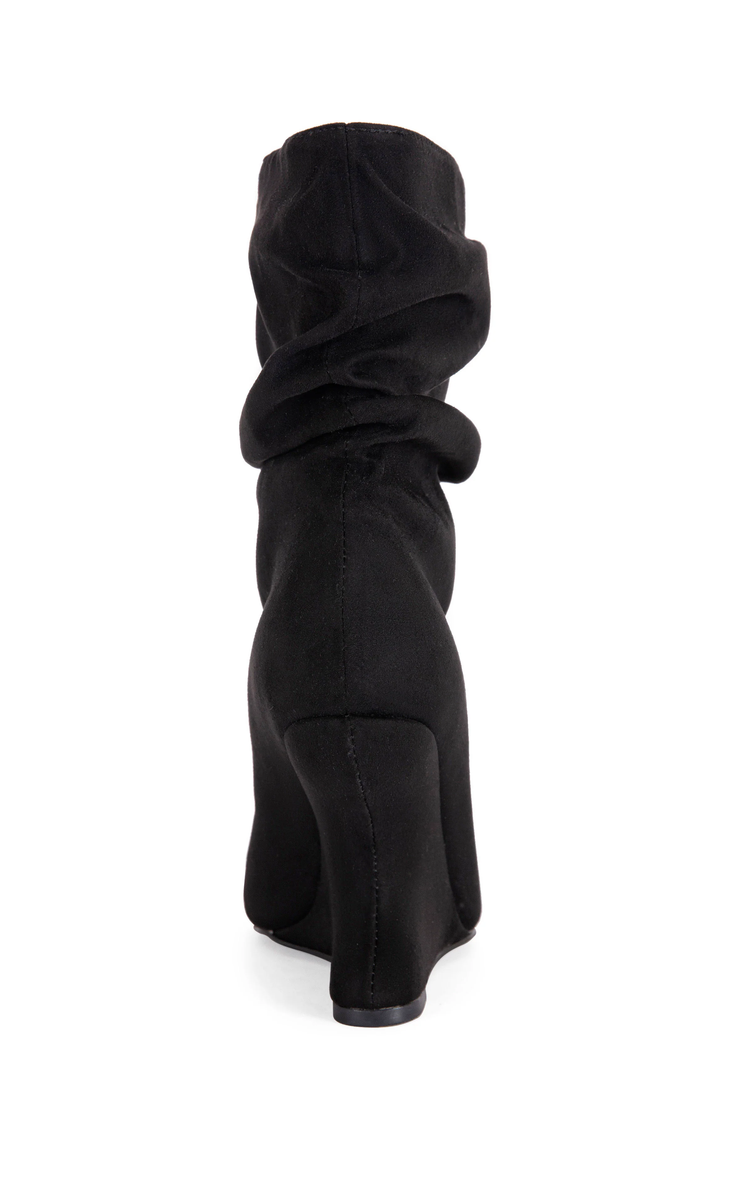A stunning fusion of high-fashion drama and buttery-soft faux suede. This chic pull-on bootie features a unique 4.5" curved wedge and a trendy slouchy 8" shaft that adds effortless "cool girl" volume to any outfit. Designed with an elegant almond toe and a generous 17" circumference, these statement wedges are the perfect streetwear-inspired staple for elevating your day-to-night look.