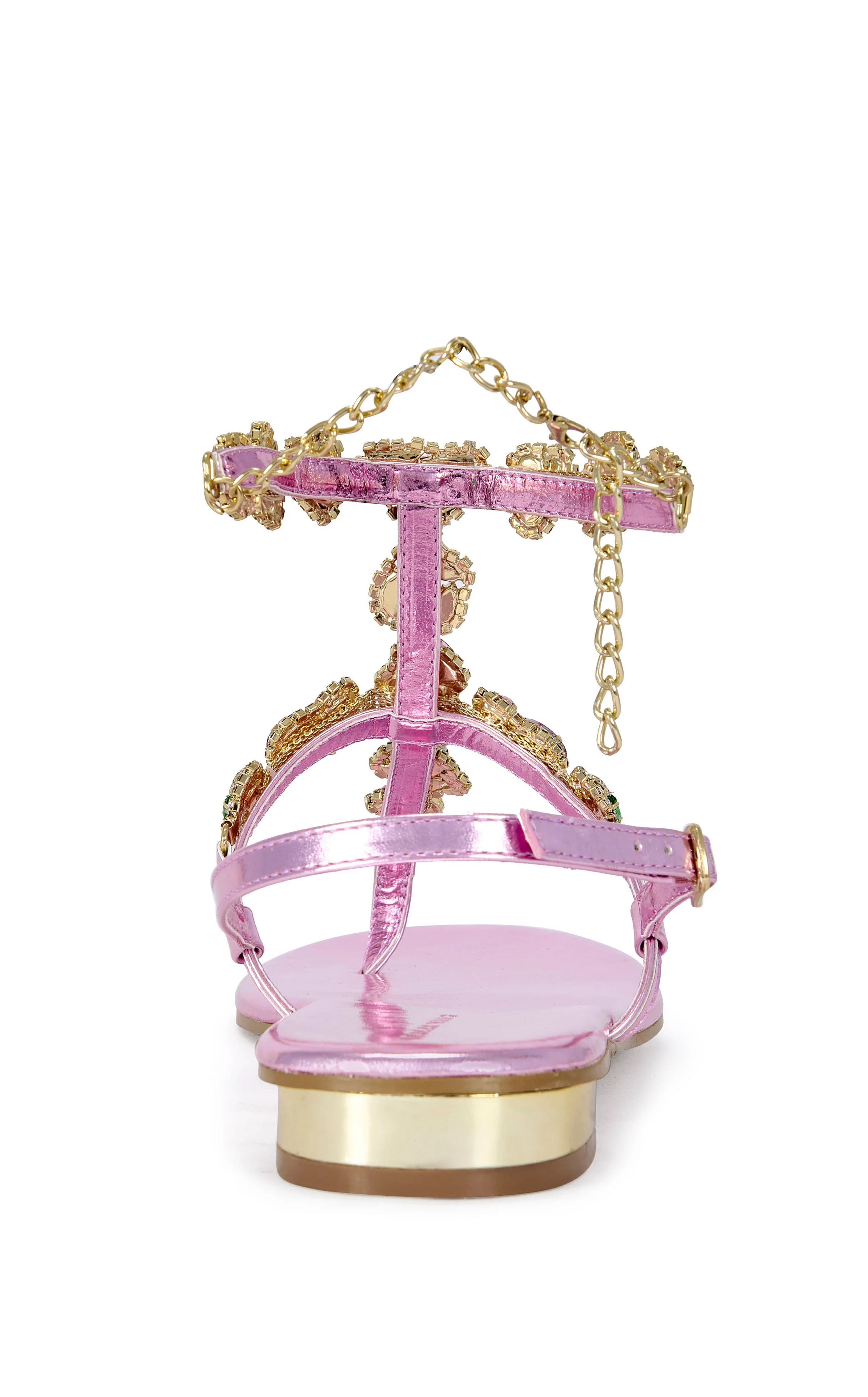 If you’re feeling a little "plain," it’s probably because you aren’t wearing these yet. The MARINELLA-PINK is the ultimate metallic flat sandal for when you want to look like a literal modern-day princess on dry land. Drenched in a vibrant hot pink finish and dripping in blushing rose crystals, these sandals are for the woman who knows that "less is more" is just a lie people tell when they don't have enough glitter.