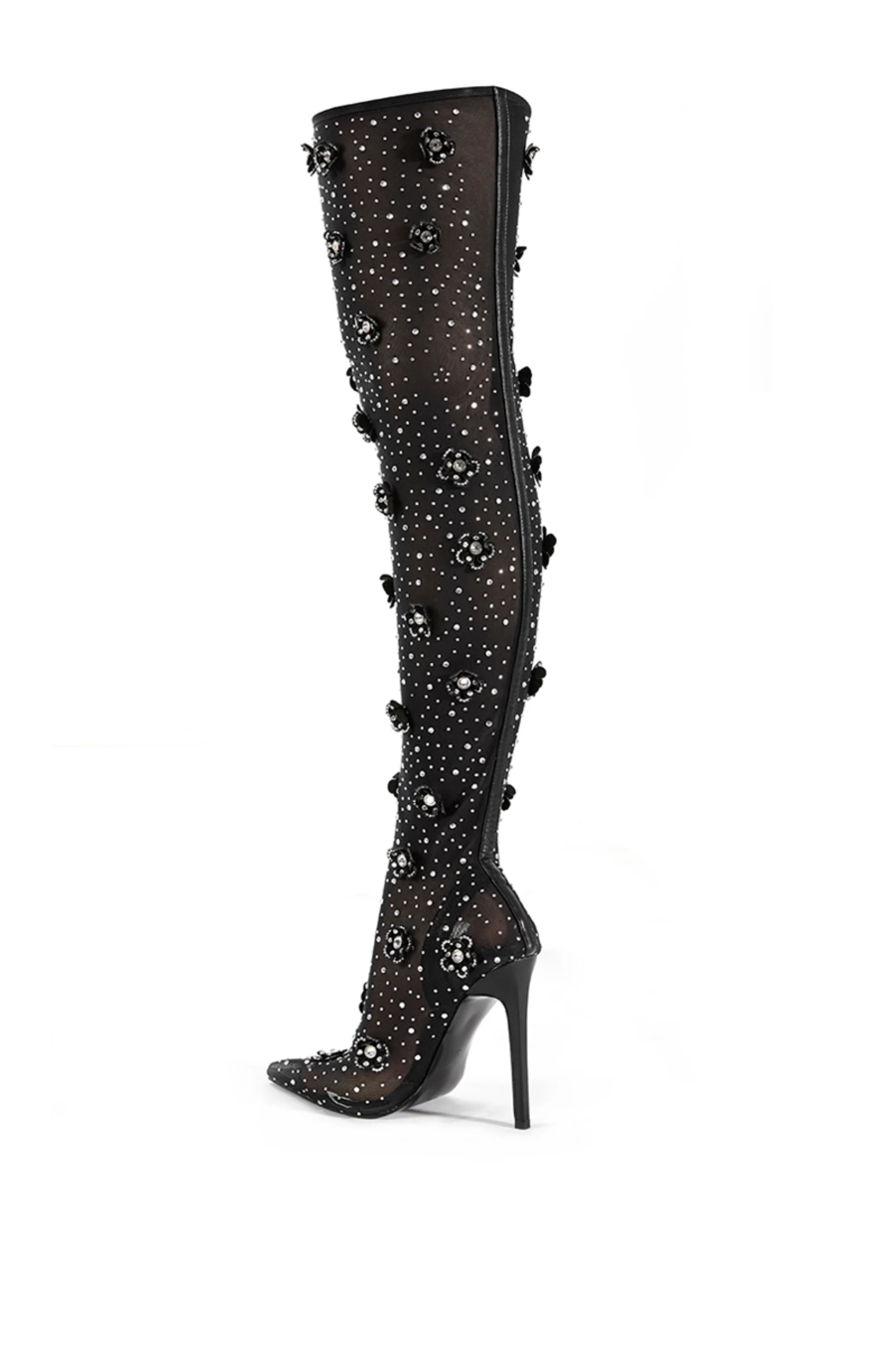 Introducing MARLOWE-BLACK STILETTO BOOT, the perfect combination of fashion-forward style and luxury details. Crafted from black fabrication, these thigh high boots feature a pointed toe and scattered rhinestone embellishments with floral accents — an elegant and flirty shoe to make a statement in for a night out or special occasion