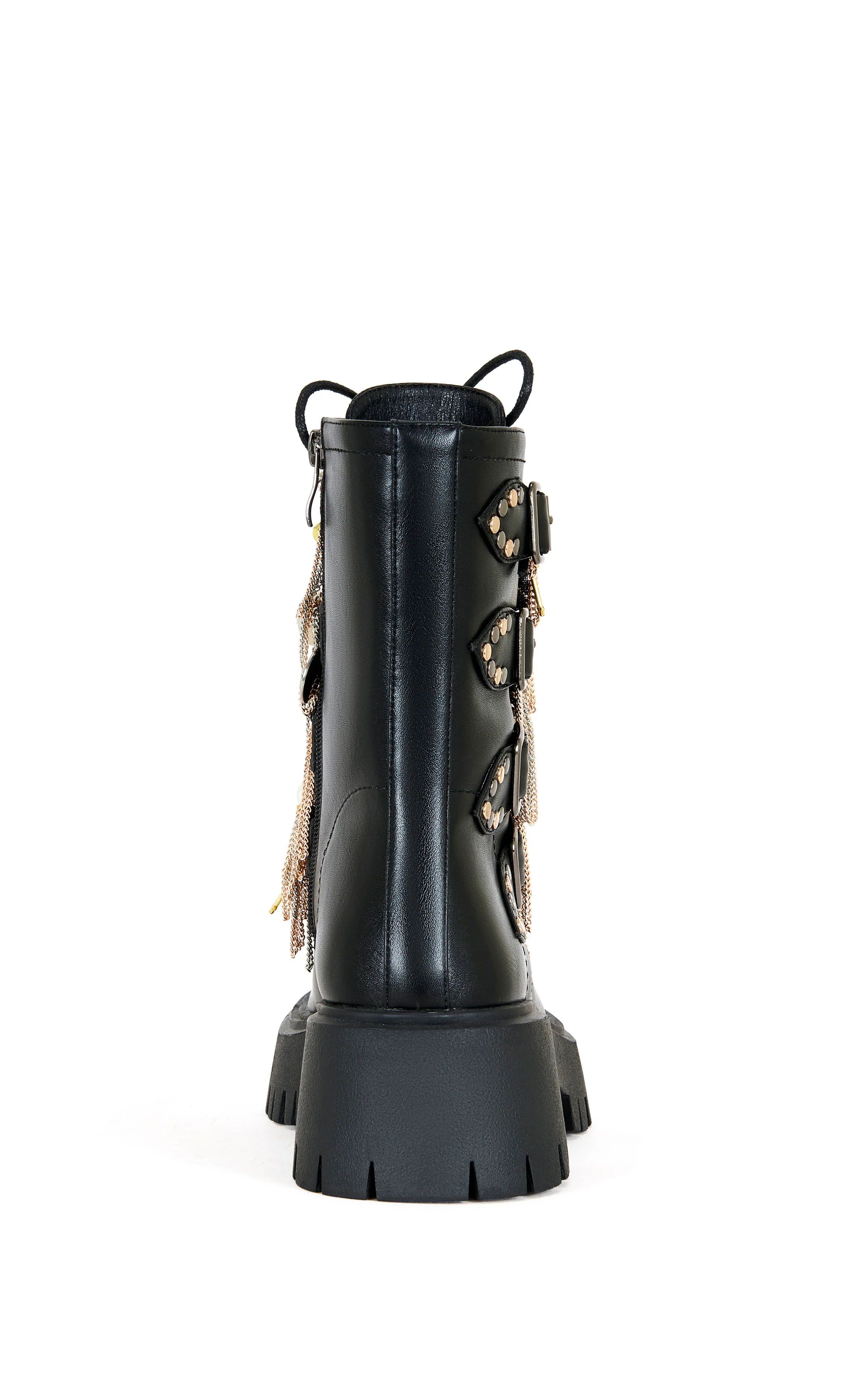 Combat boot with bold buckle detailing and chain embellishments all over, serving statement attitude.
