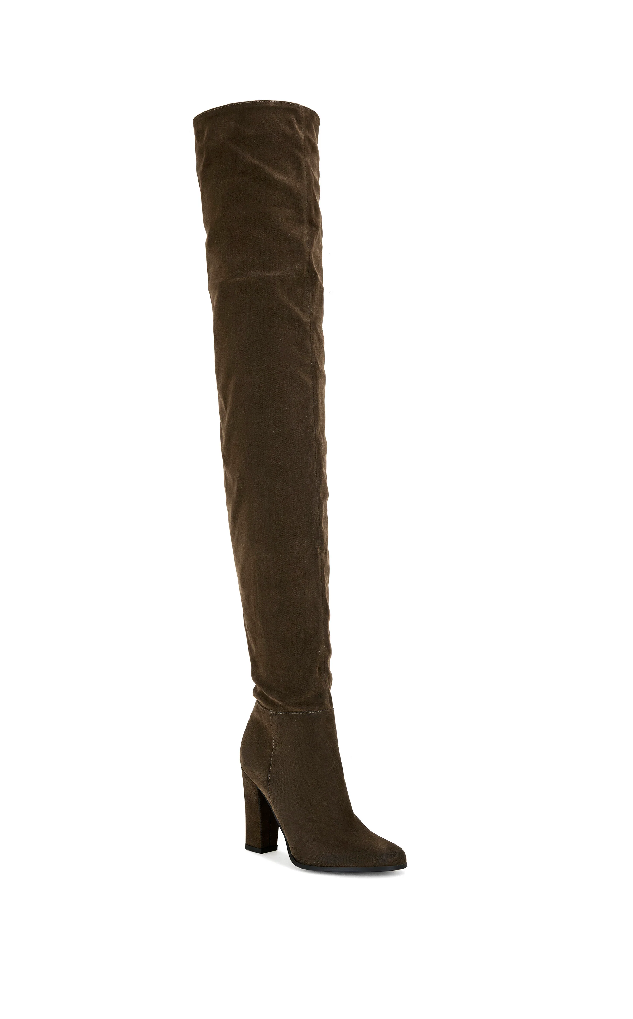 Thigh-high block heel boot in luxe brown faux suede with a round toe, the perfect mix of sleek silhouette and everyday sophistication.