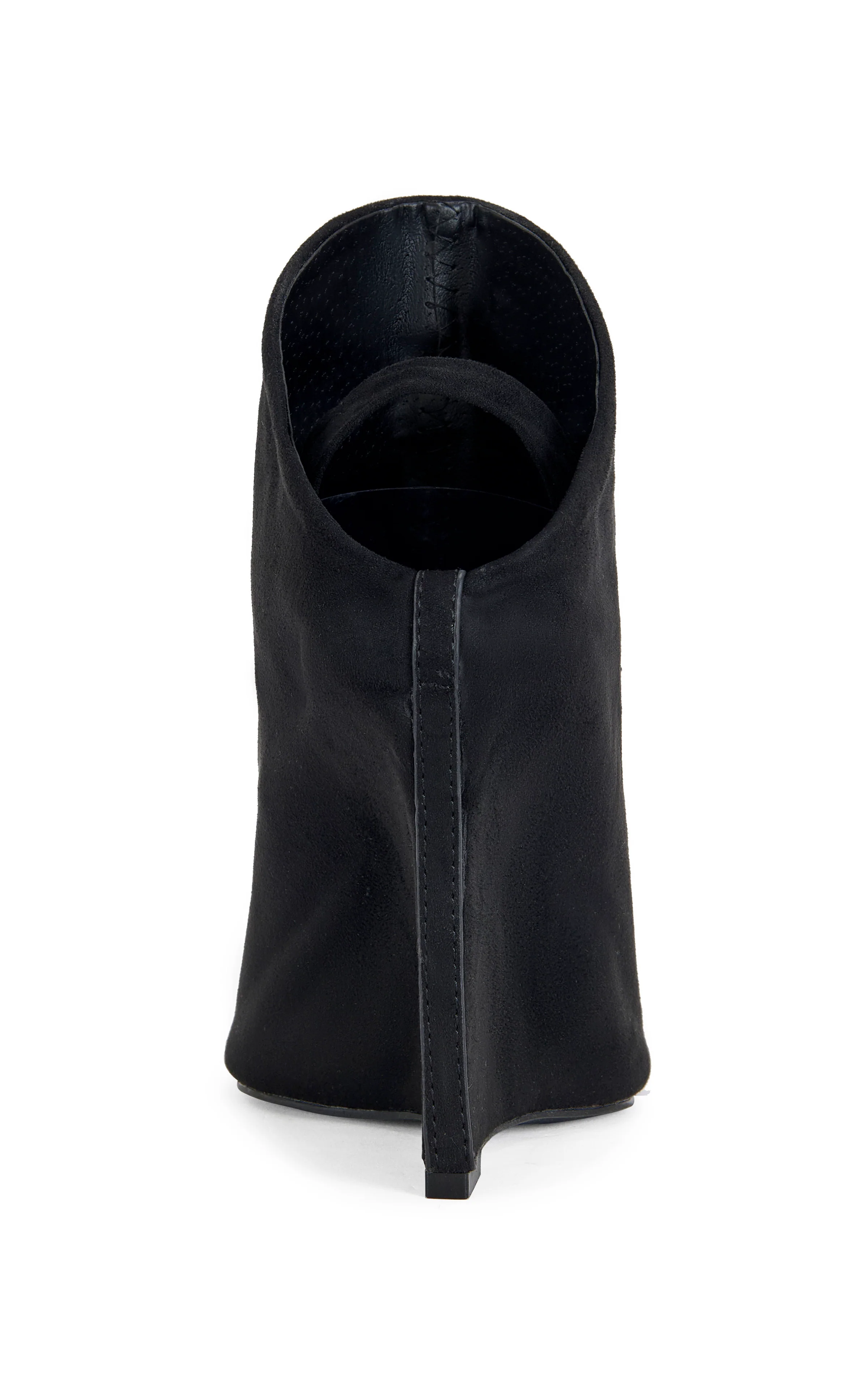 Angular wedge peep-toe bootie with a flexible elastic heel strap—modern, sculptural, and designed for effortless comfort.