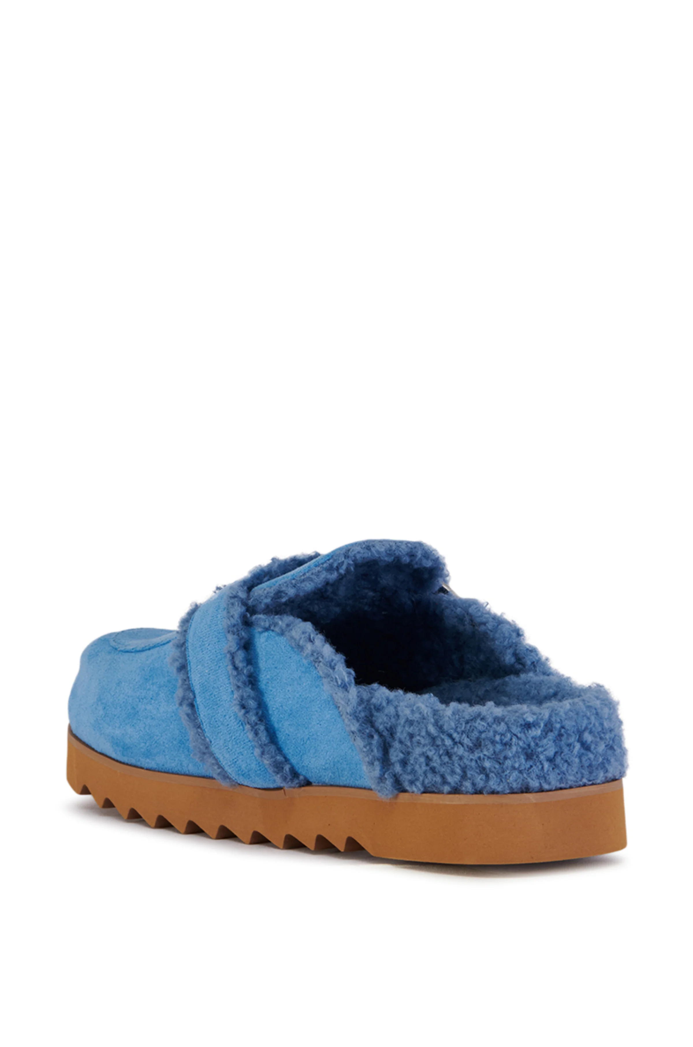 Keep your feet cozy with our SIMAH flat. These blue statement mules feature a soft faux suede exterior and a comfortable faux sherpa lining. The ridged sole and silver buckle accent add a touch of flair to the look. Stay warm and fashionable this season with our must-have mules.