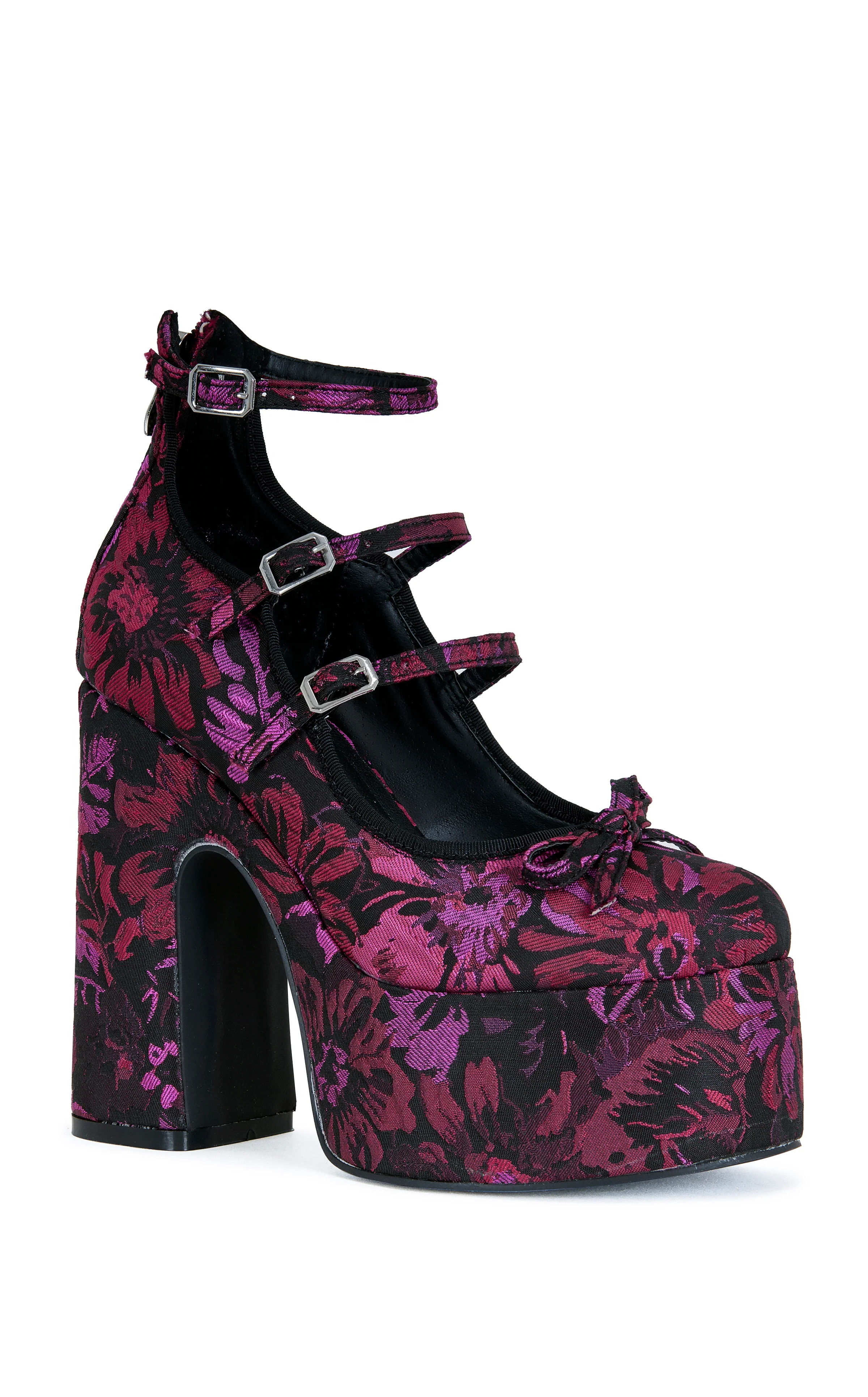 Platform closed-toe heel with delicate bow and skinny buckle straps, featuring a bold black and fuchsia floral pattern for a playful yet polished statement.