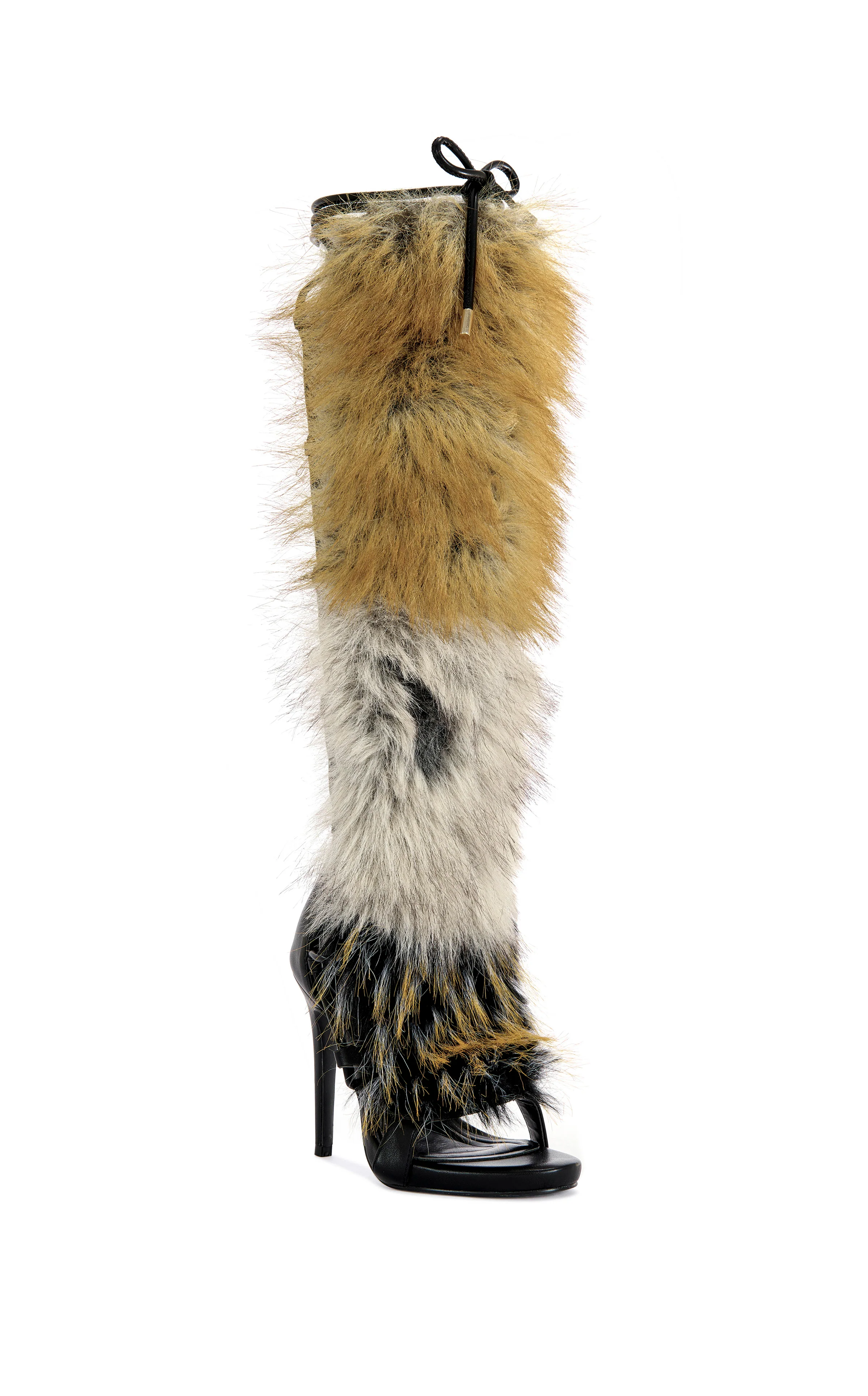 The It-Girl stiletto sandal boot with wrap-around closure and luxe faux fur down the center front—bold, playful, and made to turn heads.