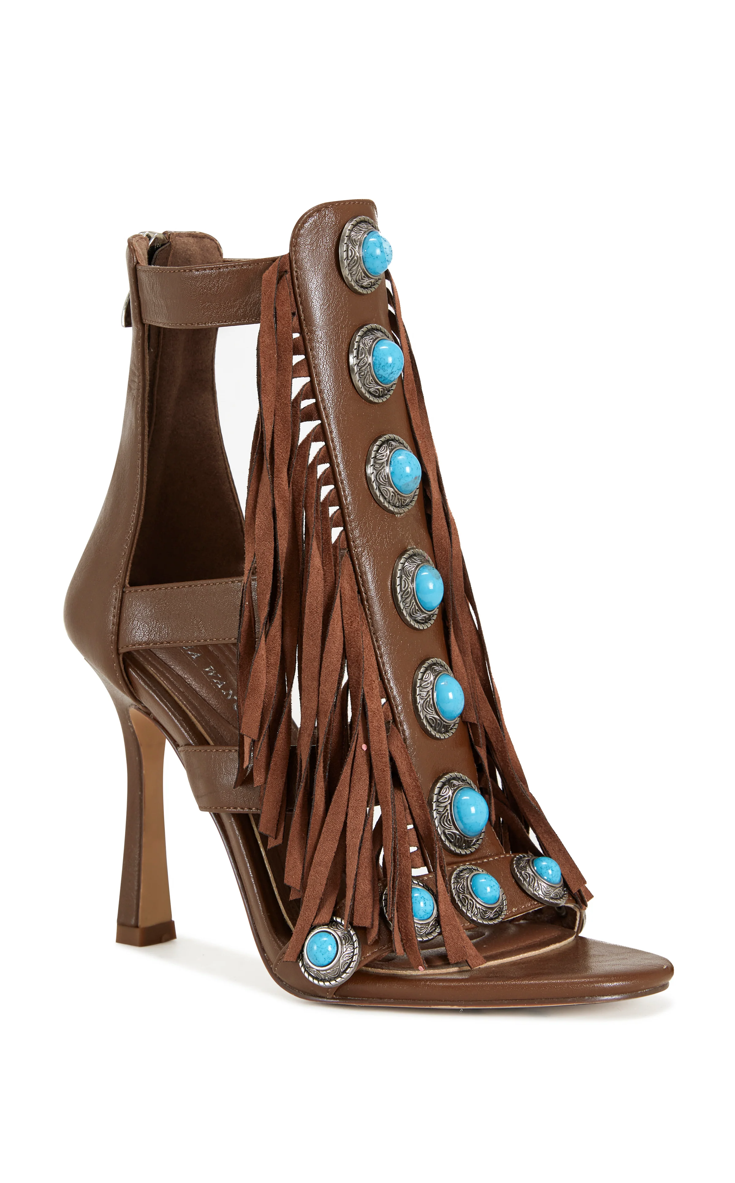 Faux leather fringe stiletto sandal boot with turquoise stones down the center—bold, western-inspired, and effortlessly statement-making.
