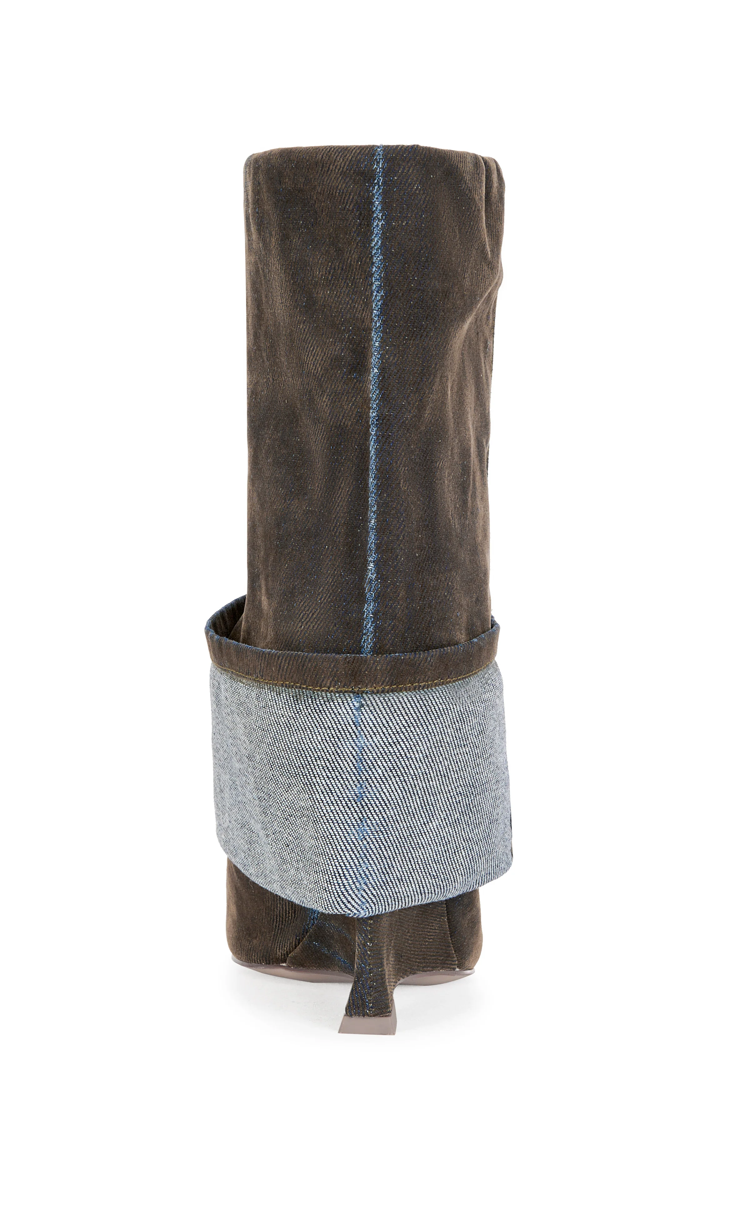 Washed brown denim foldover peep-toe bootie, designed to mimic the look of folded-up jeans with a bold, fashion-forward twist.