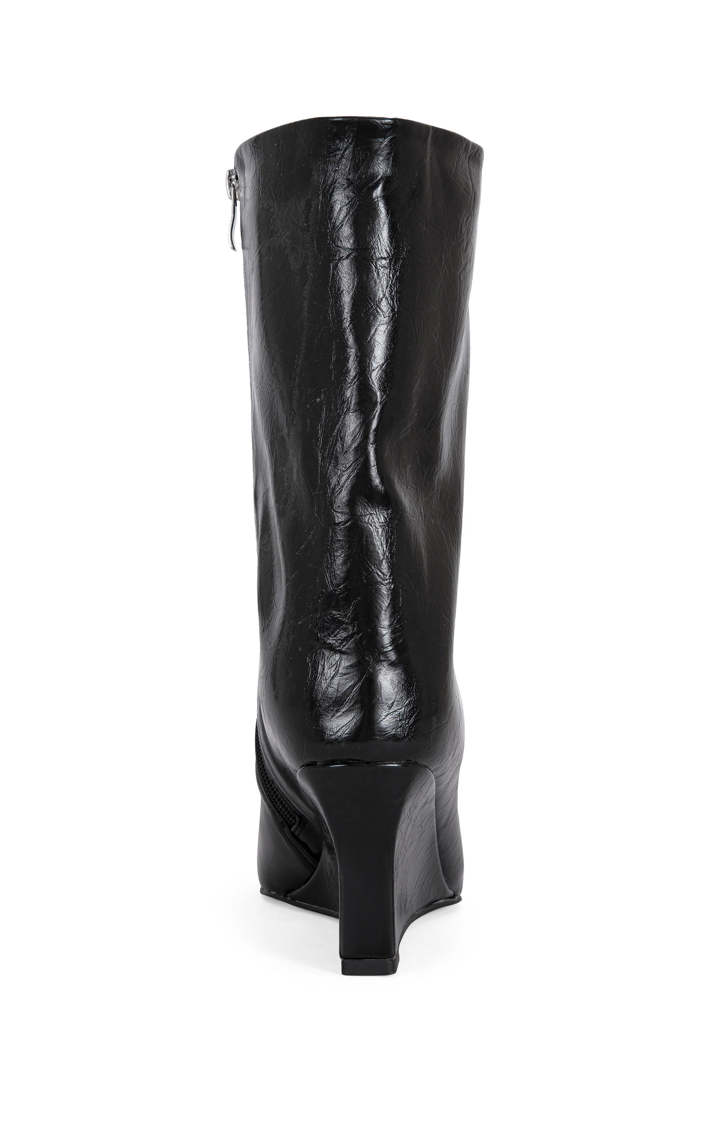 Black bootie with a sharp point toe and sculptural angled wedge—bold, modern, and effortlessly cool.