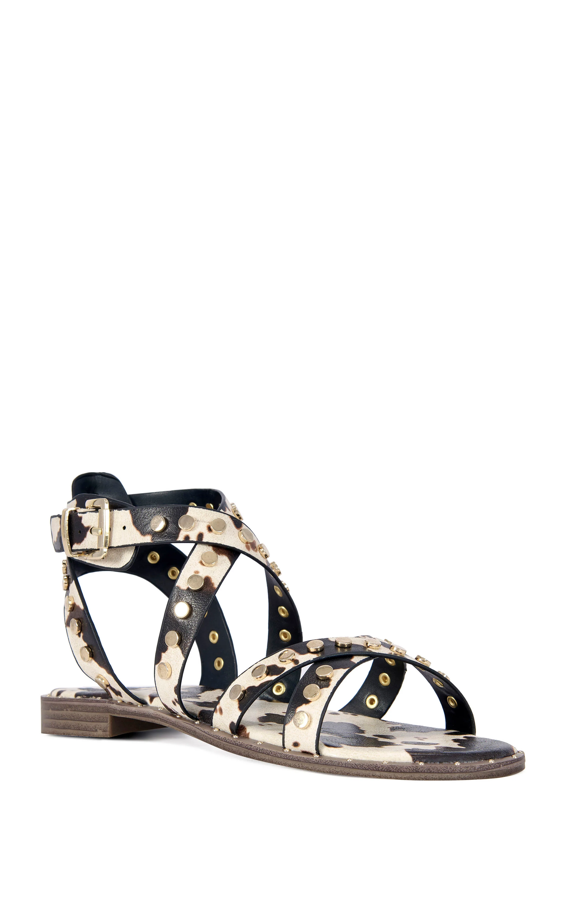Unleash your inner rockstar with a western twist in these edgy, biker-chic sandals, featuring a bold cow-print pattern accented by high-shine studs for a total "y'all-star" vibe. The perfectly balanced round toe keeps your silhouette feminine while the metallic hardware stays tough, and a secure buckle ankle strap ensures you can keep up with every RSVP on your social calendar.